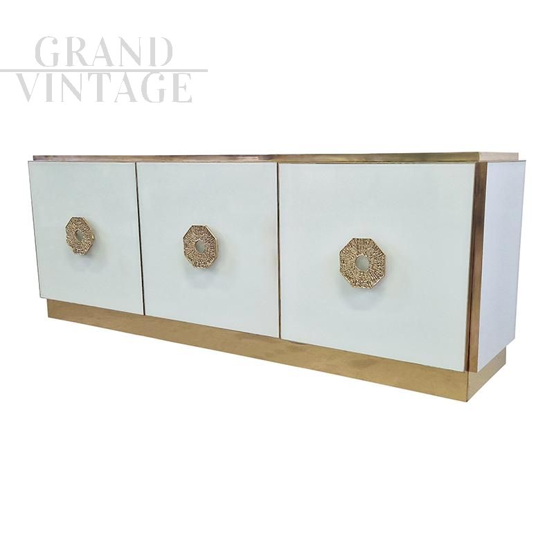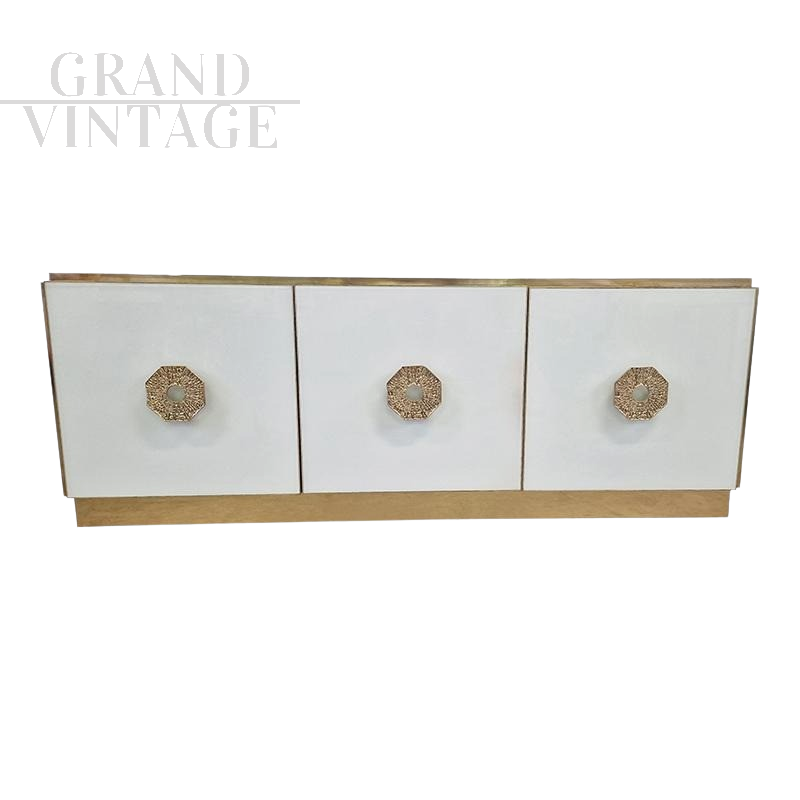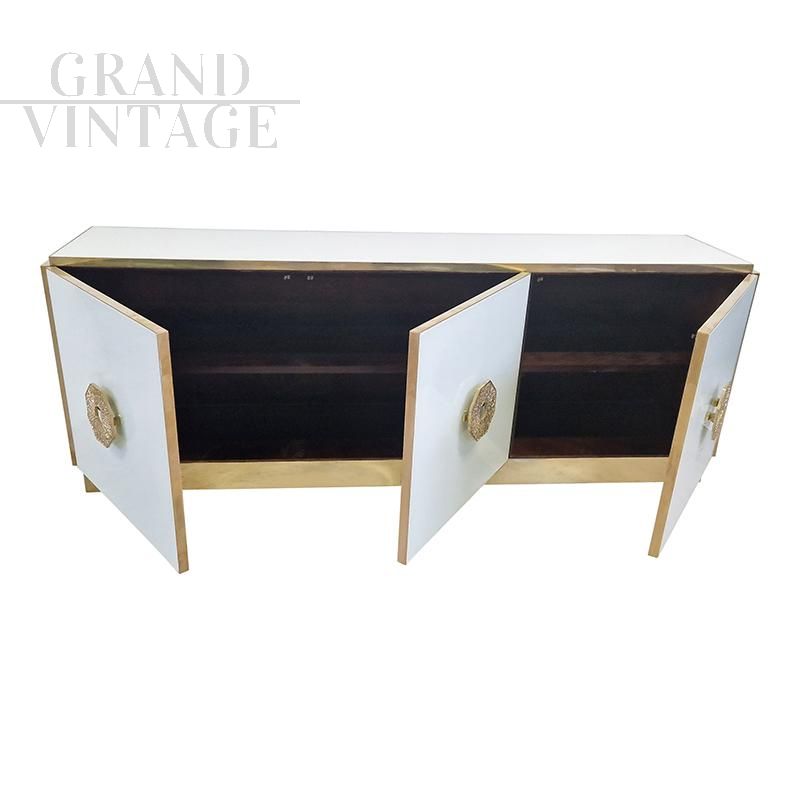 Credenza con due vani chiusi da tre ante, interamente realizzata a mano, con struttura in legno rivestito in vetro di Murano bianco. Profili, maniglie e zoccolo sono in ottone dorato.