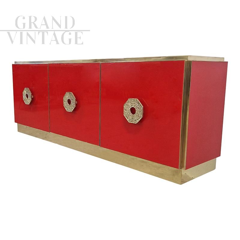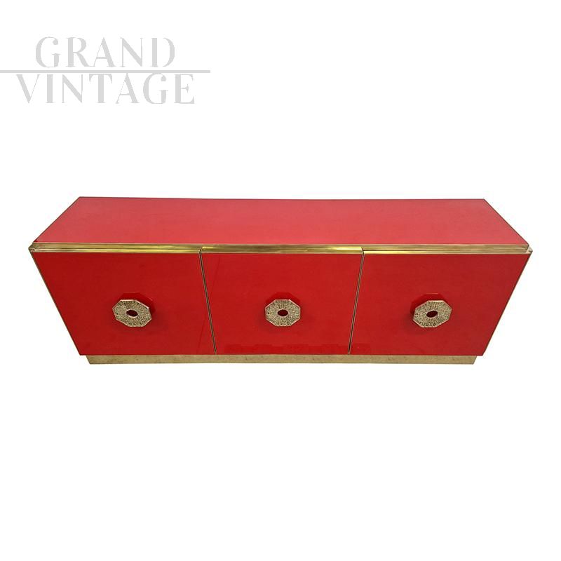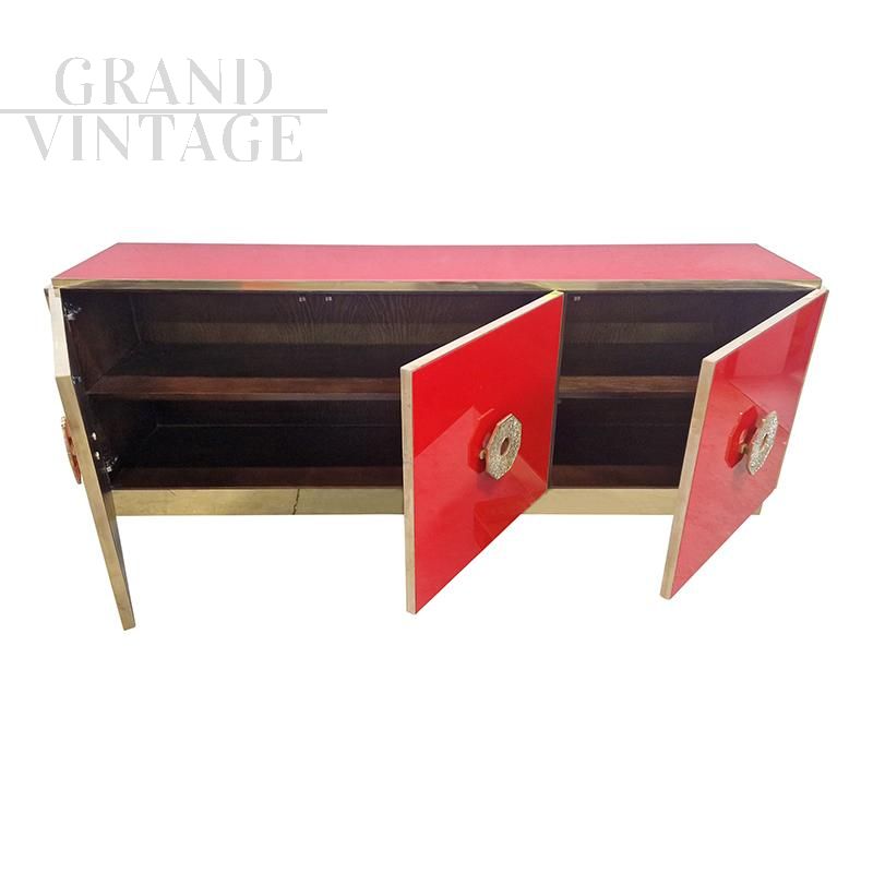 Credenza design con due vani chiusi da tre ante, interamente realizzata a mano, con struttura in legno rivestito in vetro di Murano rosso. Profili, maniglie e zoccolo sono in ottone dorato.
