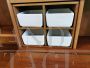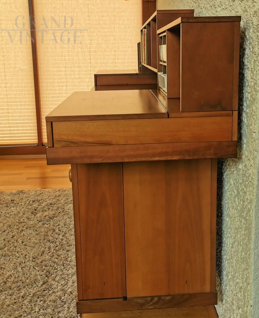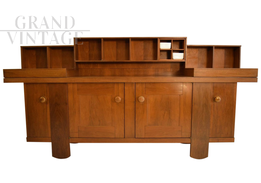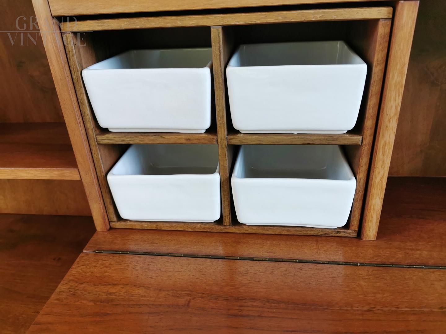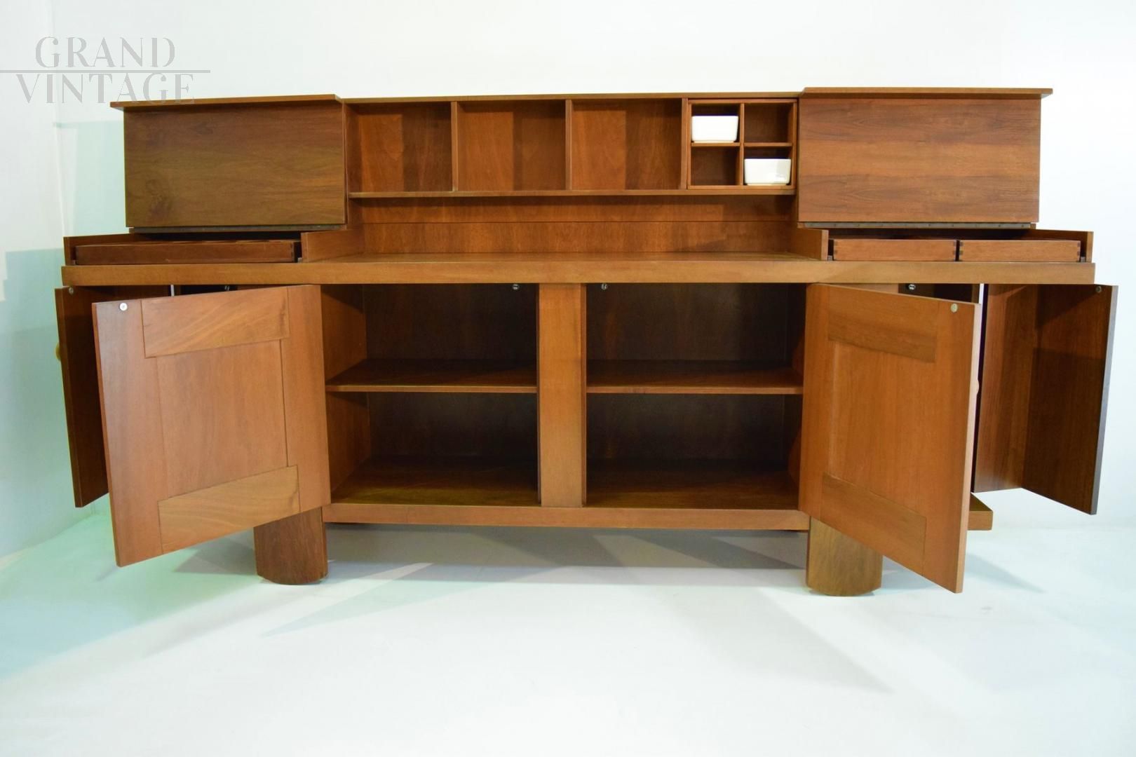 Meravigliosa credenza disegnata da Silvio Coppola per Bernini nel 1968. La struttura è in legno di noce e presenta otto vani della stessa misura, un vano per vasi in porcellana, due vassoi rivestiti con ribalte, due ante centrali, due ante angolari, quattro ripiani regolabili, accessori e 4 contenitori in ceramica bianca. In ottima condizioni generali!