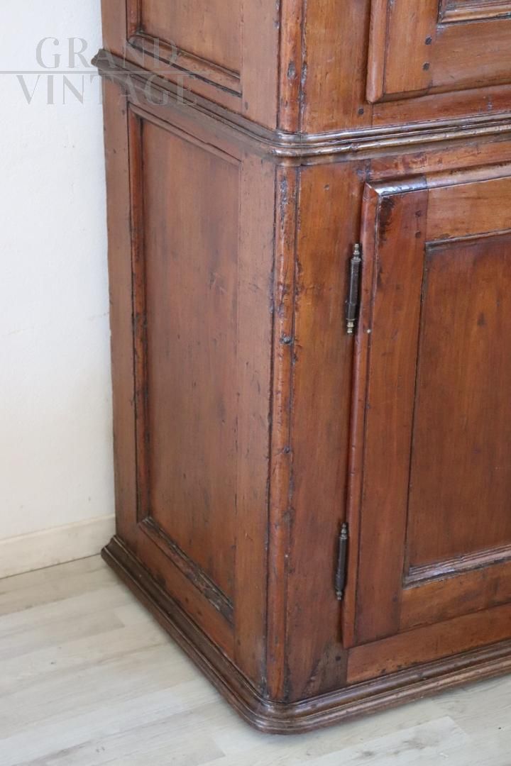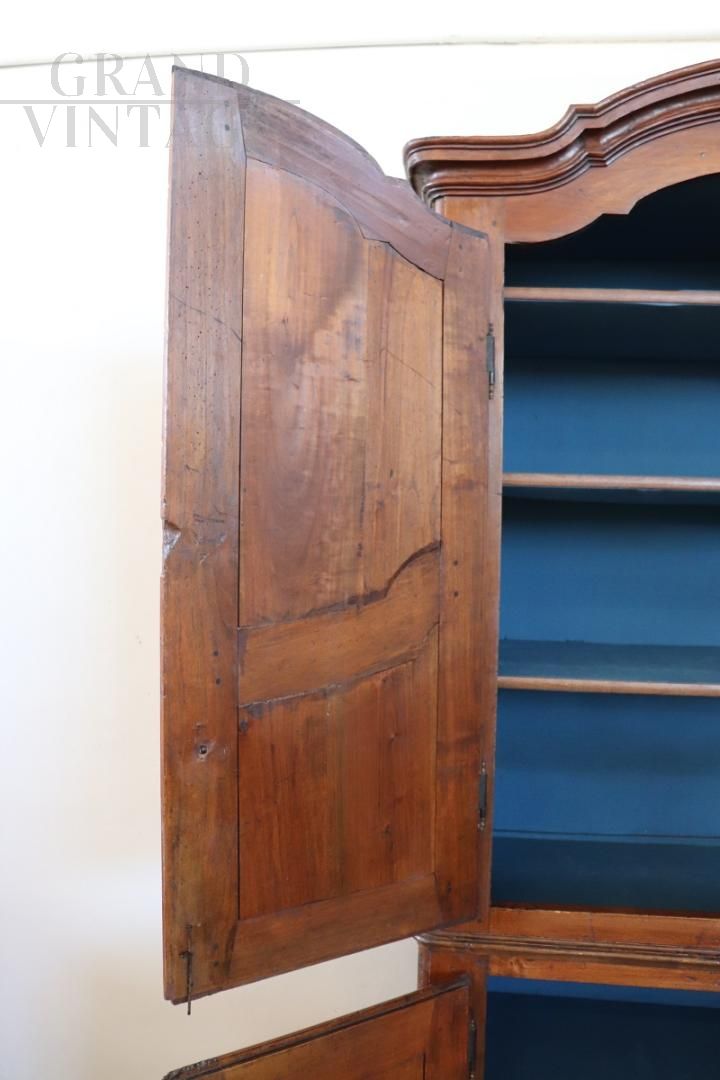 Vi presentiamo questo fantastico armadio o credenza antica italiana della metà del XVIII secolo. Un armadio maestoso dal fascino antico e senza tempo! Realizzata in pioppo massello, le sue caratteristiche stilistiche fanno pensare che sia stata realizzata da laboratori di ebanisteria della regione Piemonte, nell'Italia settentrionale durante l'epoca Luigi XV. Le sue linee semplici sono caratterizzate da alcune curve mosse nella cornice e nelle decorazioni delle ante. La sua struttura è divisa in due parti che possono essere separate, per facilitare gli spostamenti. Dal punto di vista funzionale, il mobile dispone di un ampio spazio di archiviazione, grazie a tre ripiani interni nella parte superiore e uno in quella inferiore. L'interno è rivestito in elegante tessuto blu. Prezzo trattabile