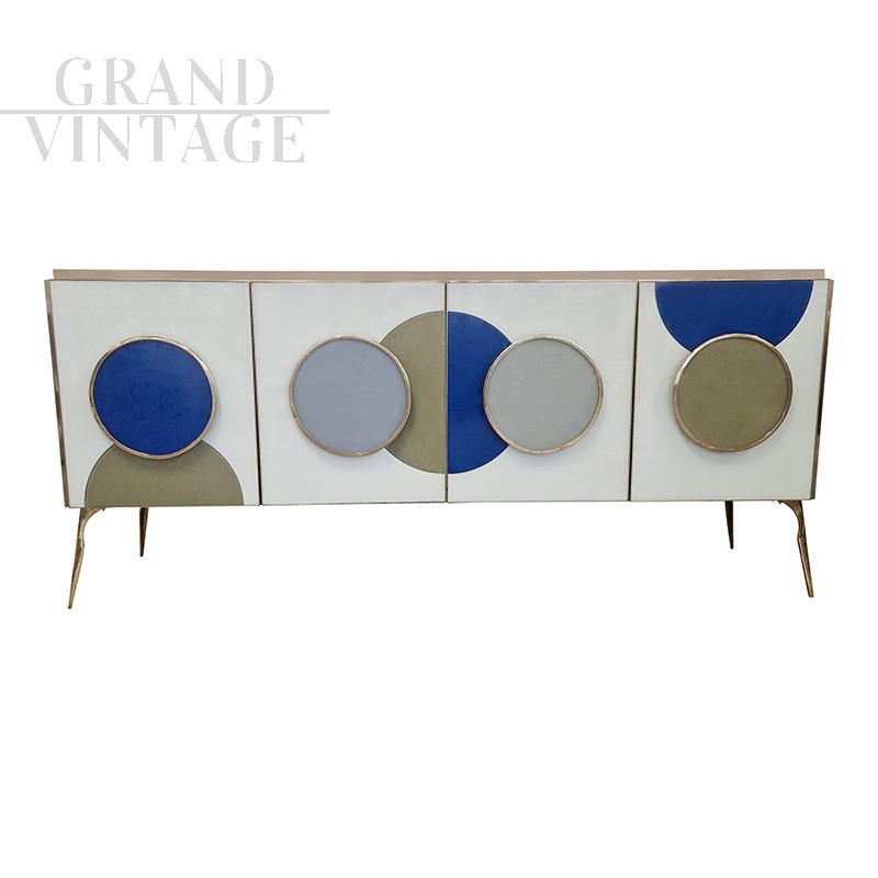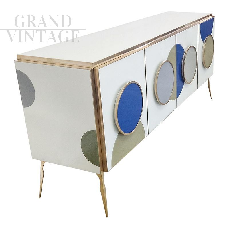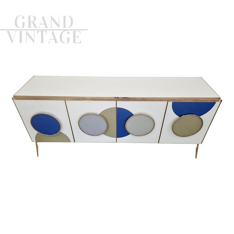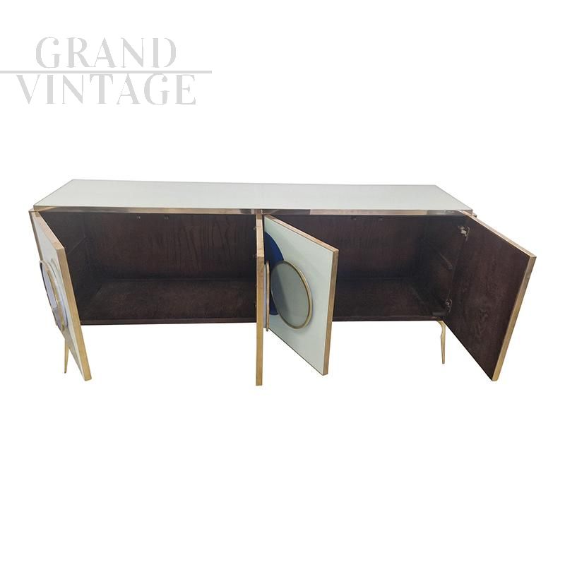 Credenza design a quattro ante con ripiano interno, interamente realizzata a mano, con struttura in legno rivestita in vetro bianco. Profili e piedi in ottone dorato. Maniglie tonde colorate retroilluminate a led.