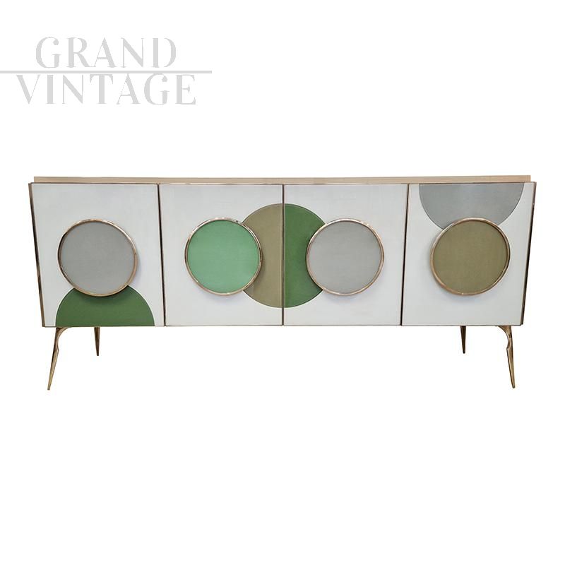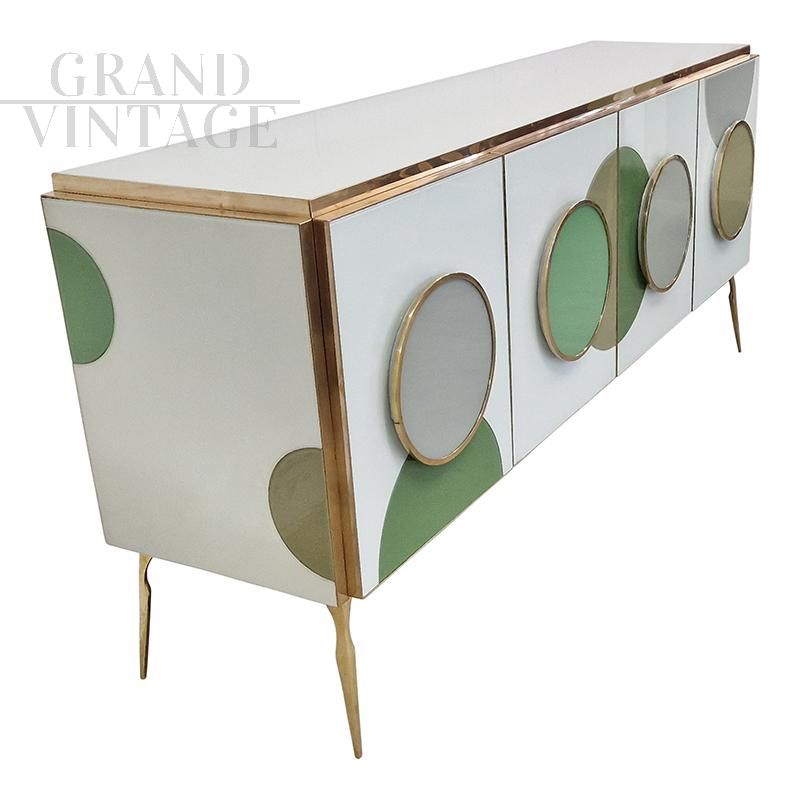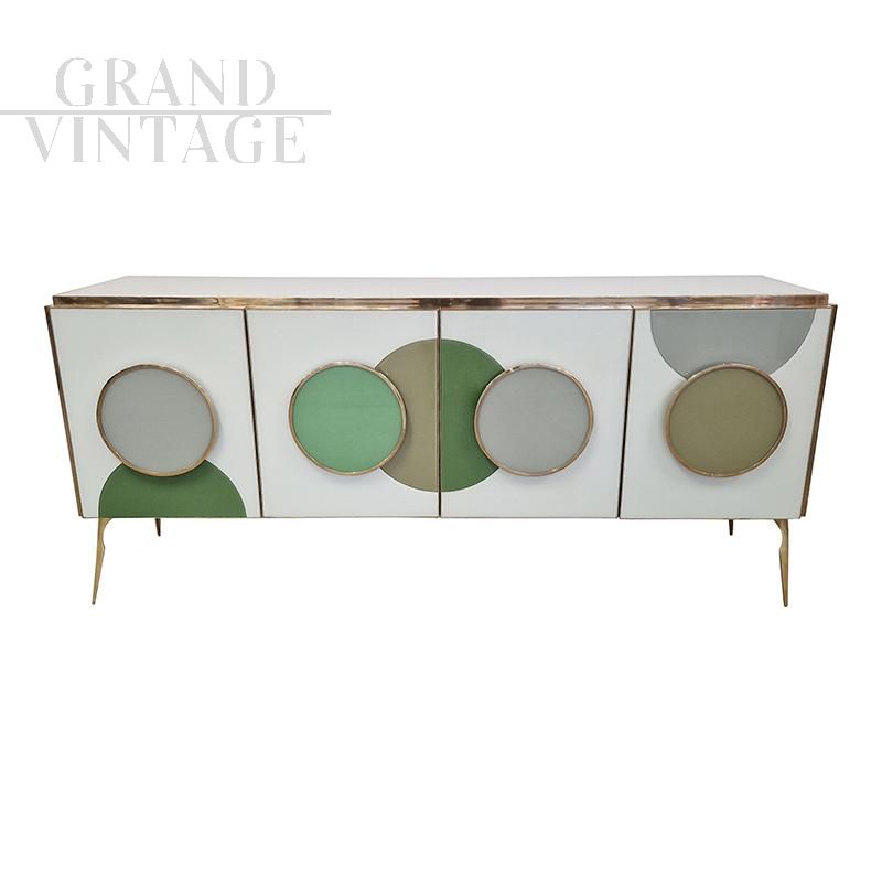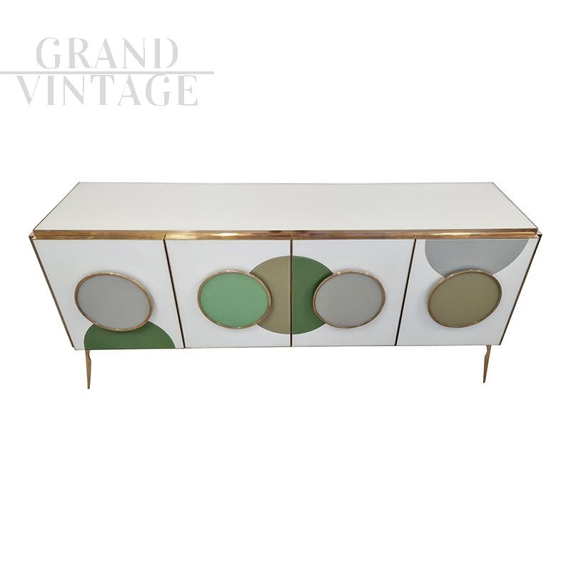 Credenza design a quattro ante con ripiano interno, interamente realizzata a mano, con struttura in legno rivestita in vetro bianco. Profili e piedi in ottone dorato. Maniglie tonde colorate retroilluminate a led.