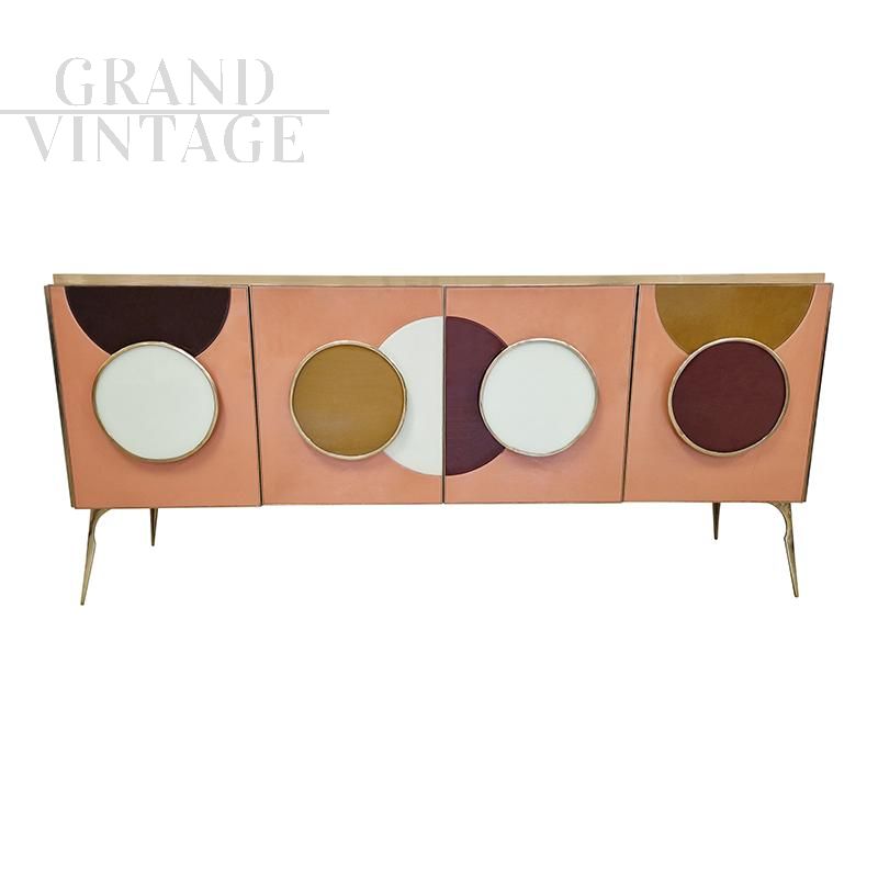 Credenza design a quattro ante con ripiano interno, interamente realizzata a mano, con struttura in legno rivestita in vetro salmone. Profili e piedi in ottone dorato. Maniglie tonde colorate retroilluminate a led.
