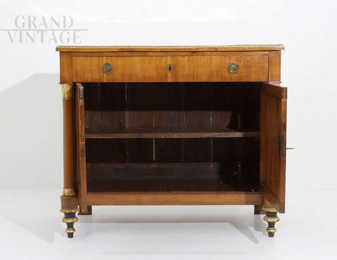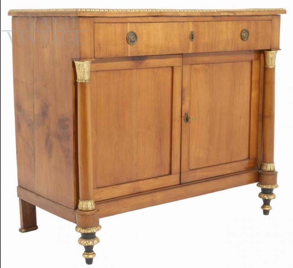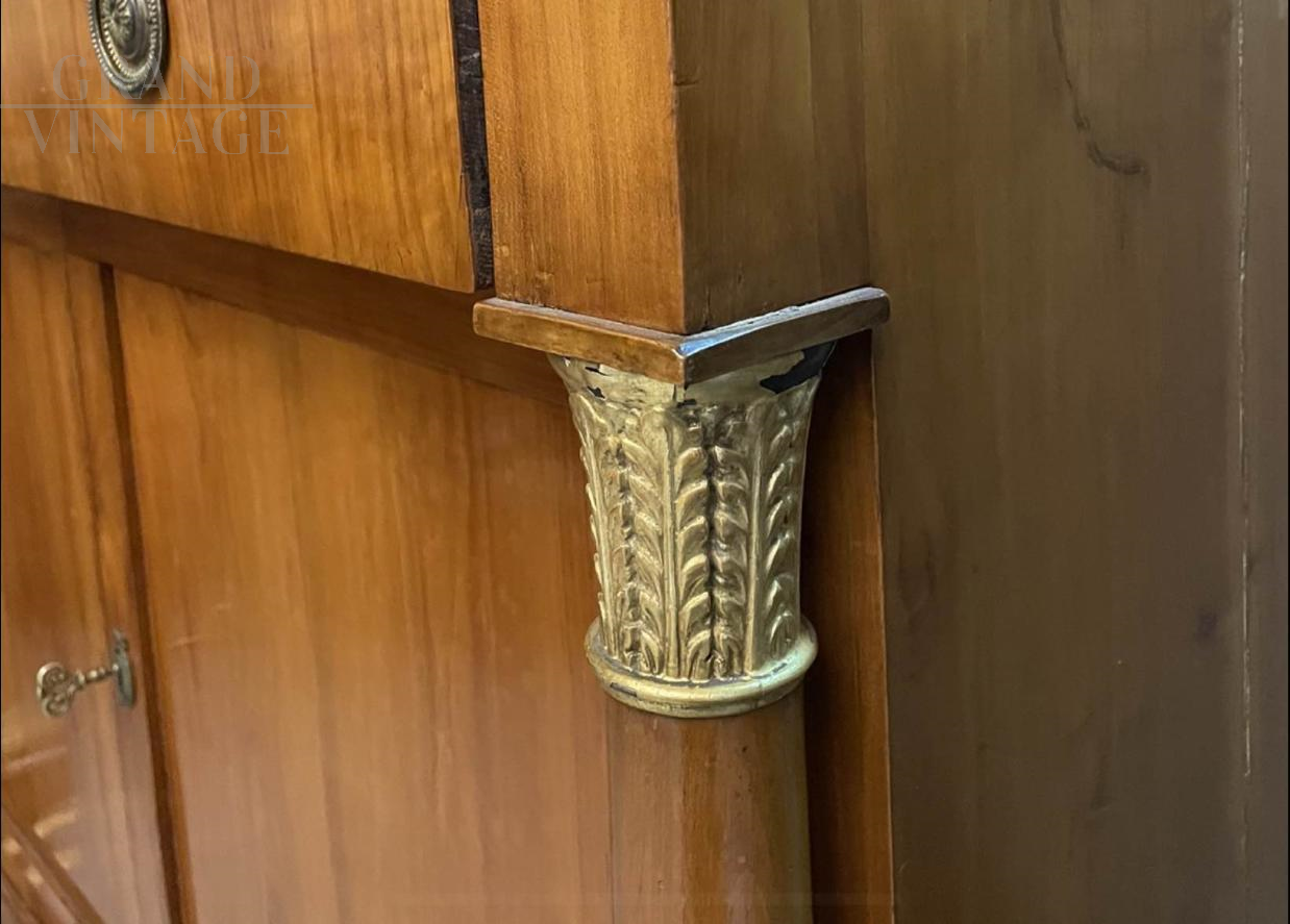 Importante credenza antica Lucchese del periodo Impero dei primi dell'800 in ciliegio, con due ante con ripiano interno, cassetto aggettante, colonne rastremate con capitelli finemente intagliati e dorati a foglia oro, piedi a trottola ebanizzati e dorati.