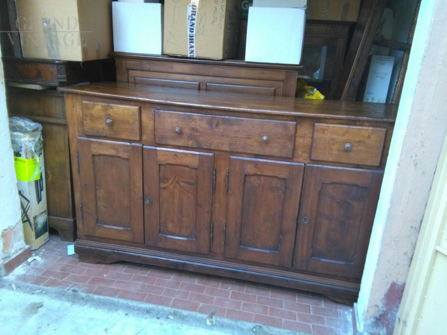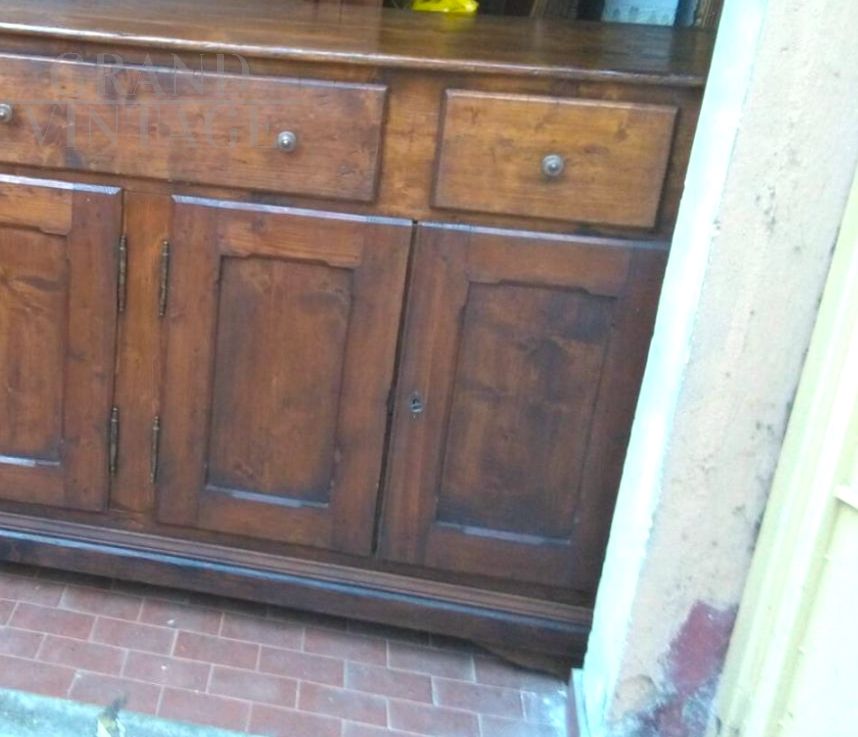 Grande credenza antica in larice della seconda metà dell'800, con 4 ante e 3 cassetti, perfetta per arredare una cucina in stile rustico o in arte povera.