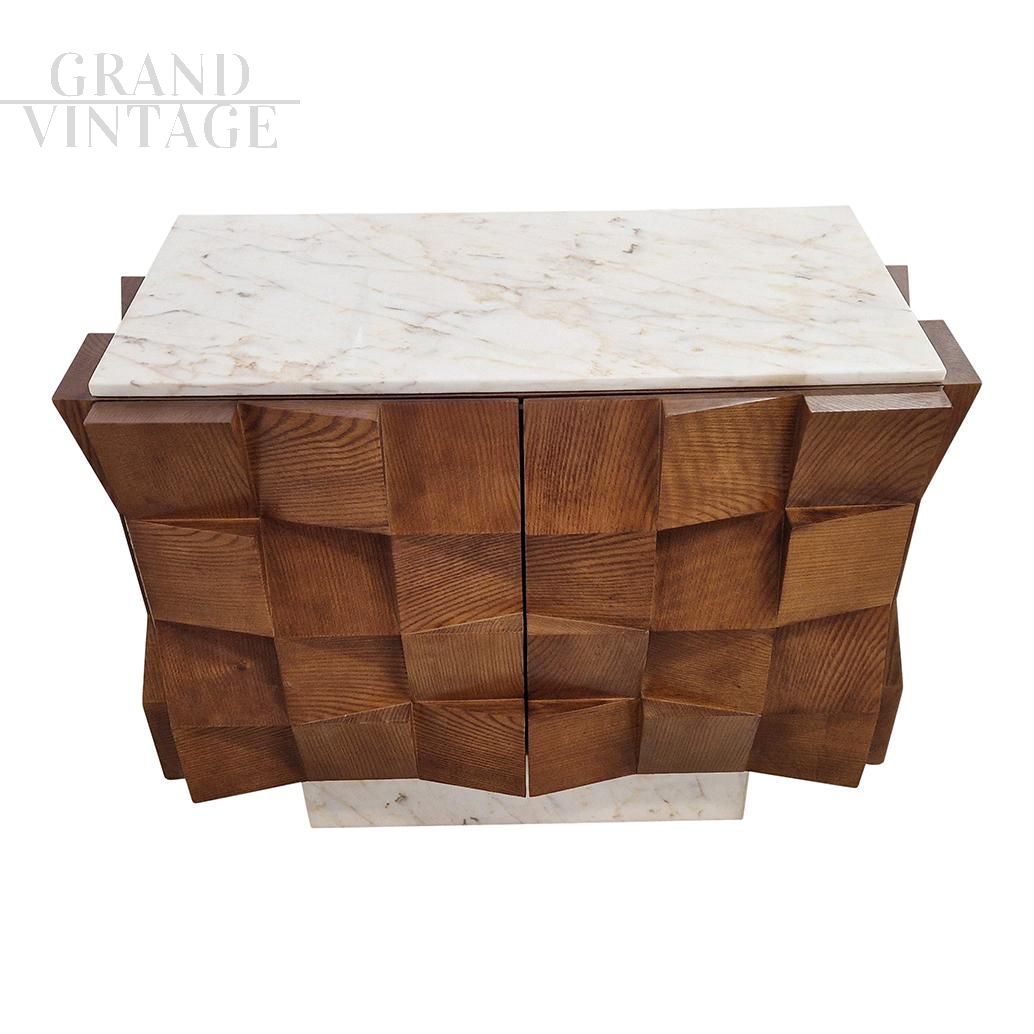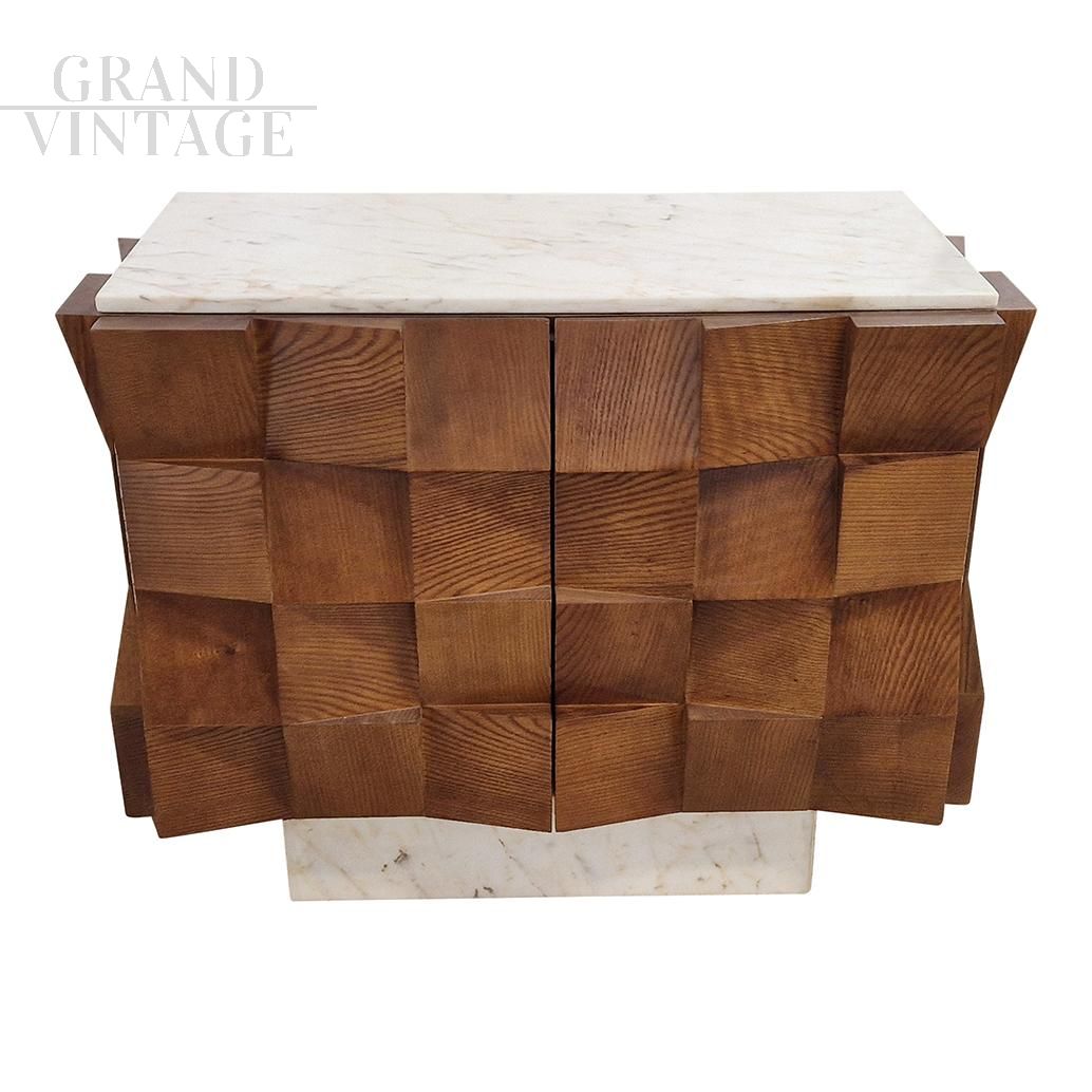 Particolare credenza vintage italiana, composta da due ante a libro, realizzata con struttura in legno massello di noce. Il design molto particolare della parte superiore delle ante centrali e dei fianchi è caratterizzato da numerosi riquadri di legno combinati insieme a diverse angolazioni per mostrare la consistenza e la profondità spaziale. La parte superiore della credenza e la base rettangolare che la sostiene sono rivestiti di marmo Bianco Carrara. Realizzata in Italia tra gli anni '70 e '80.