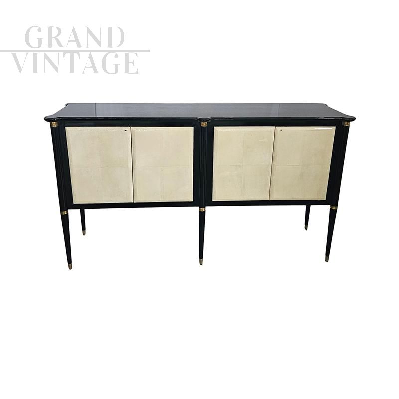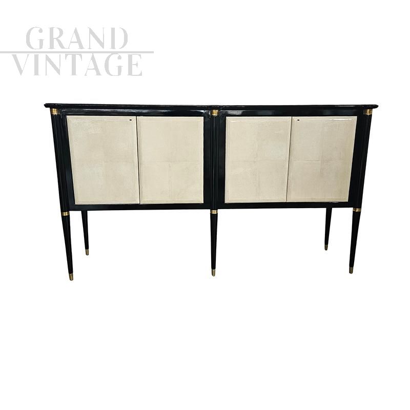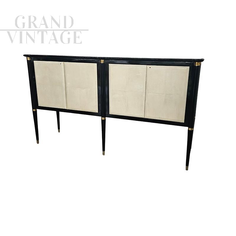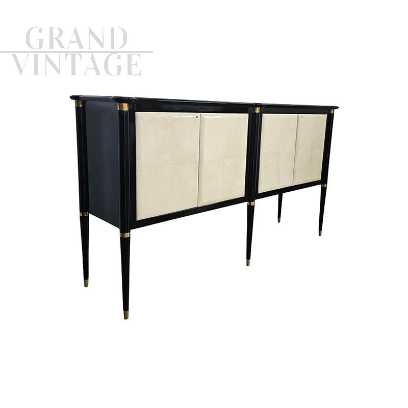 Credenza in stile art déco legno rivestita in pergamena, due ante con ripiano interno. Color pergamena naturale e nero. Inserti in ottone.