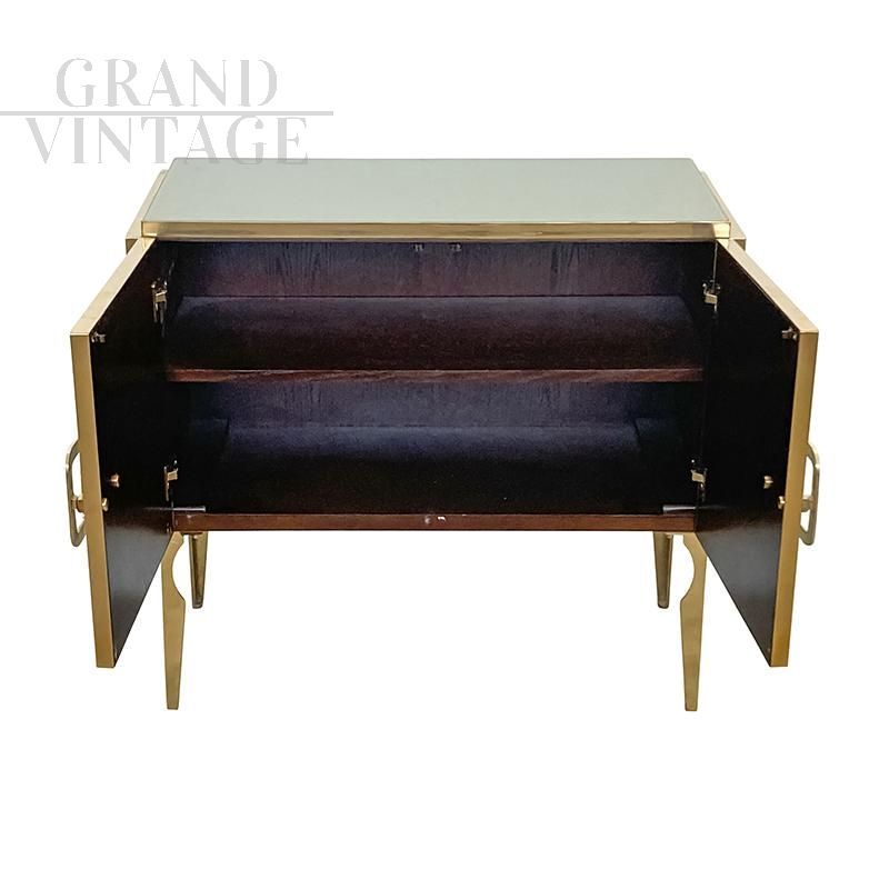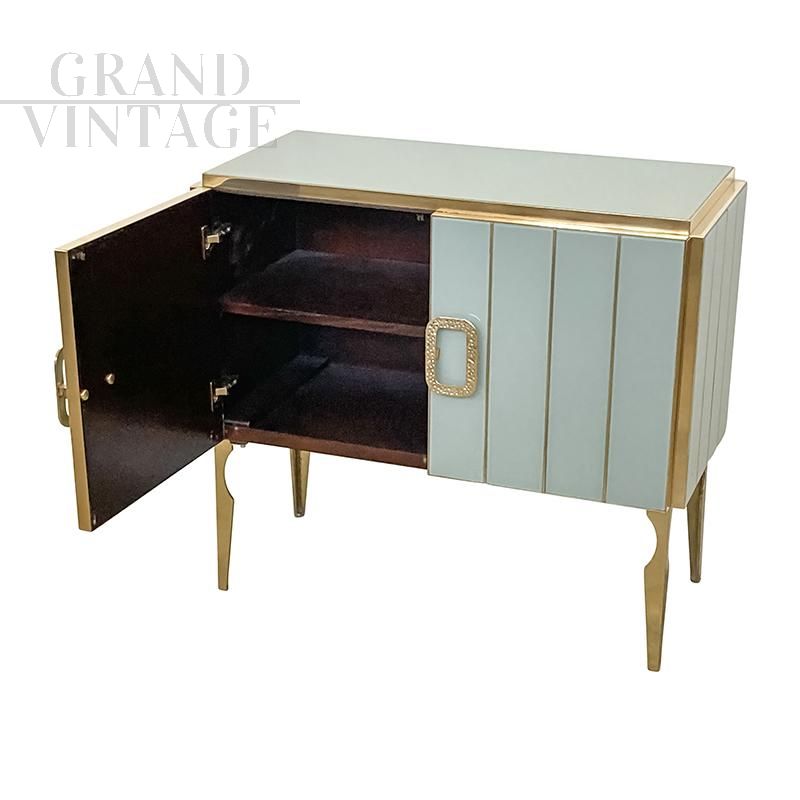Credenza con due ante, interamente realizzata a mano, con struttura in legno e finiture superficiali in vetro di Murano bianco; profili, maniglie e piedi in ottone dorato.