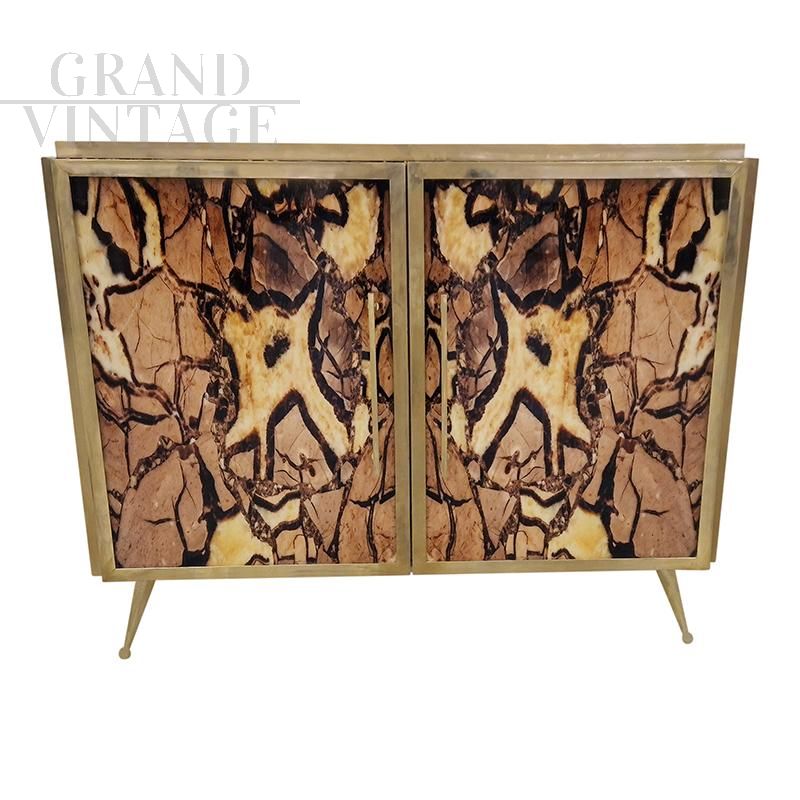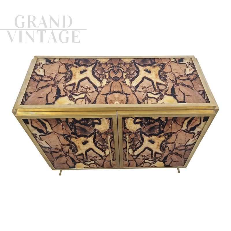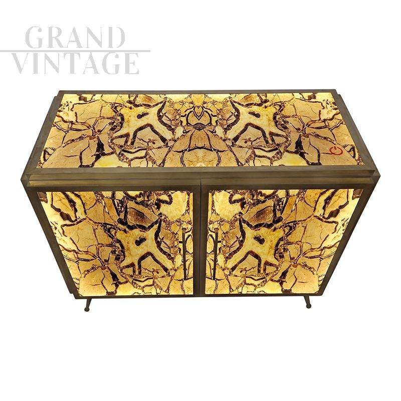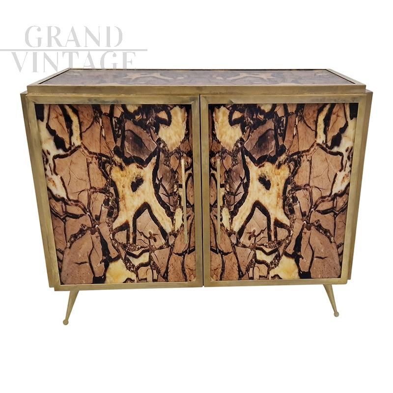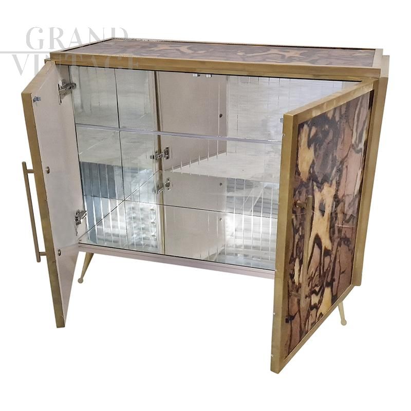 Credenza due ante interamente realizzata a mano, struttura in legno rivestita vetro stampato nelle tonalità del marrone, maniglie, profili e piedi in ottone dorato, ripiano interno in vetro. L'interno è rivestito a specchio e illuminato. La struttura si illumina con luce a gradazione con apposito telecomando.