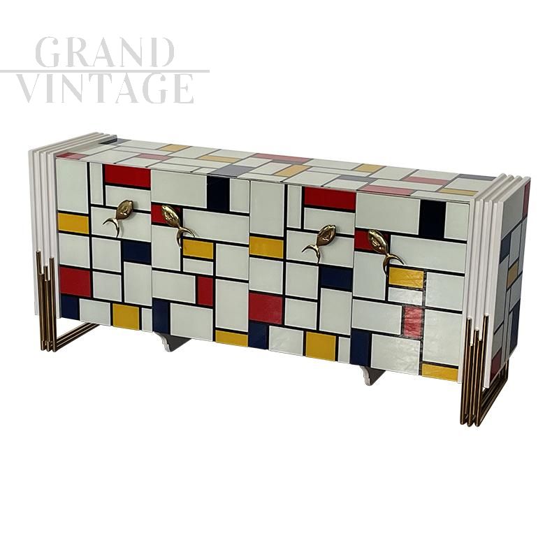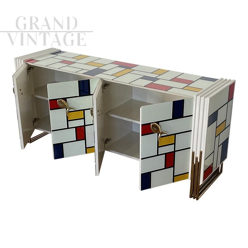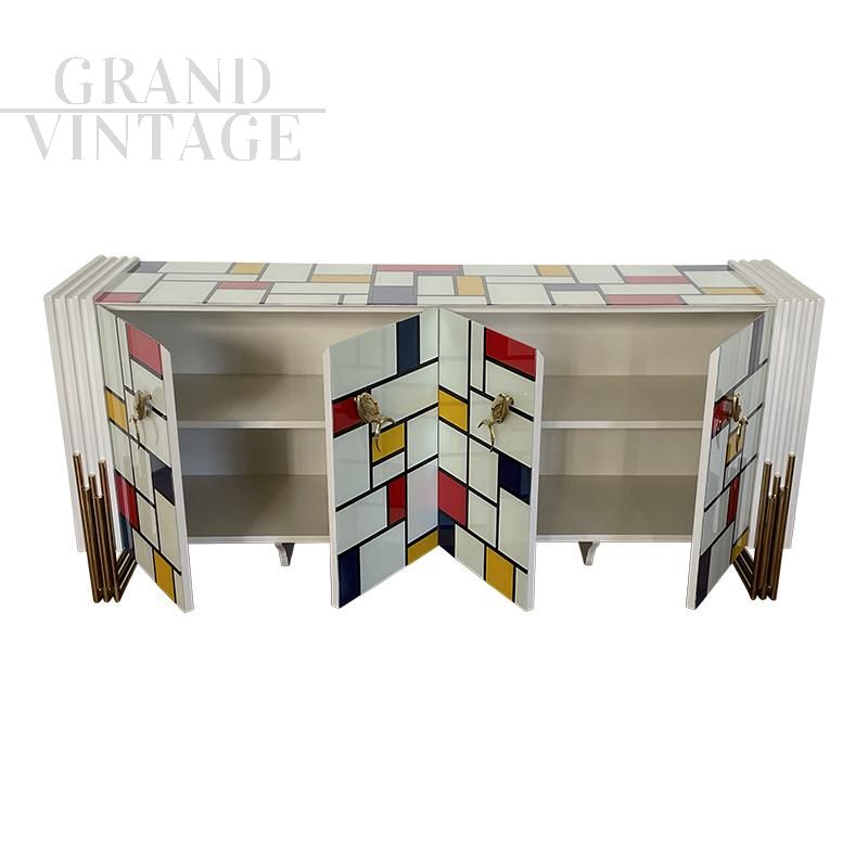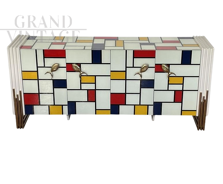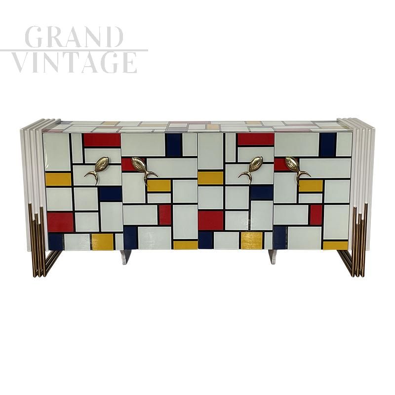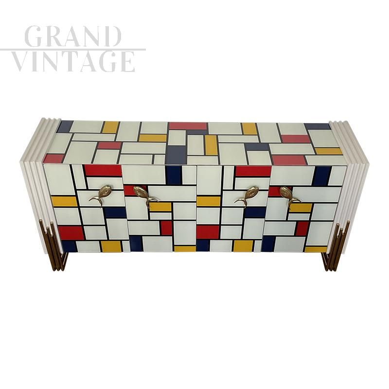 Credenza a quattro ante interamente realizzata a mano, con struttura in legno e finiture superficiali in vetro colorato stile Mondrian su sfondo bianco. Cornice laccata bianca, piedi tubolari in ottone dorato, maniglie dorate sagomate a forma di pesce, dotata di ripiano interno.