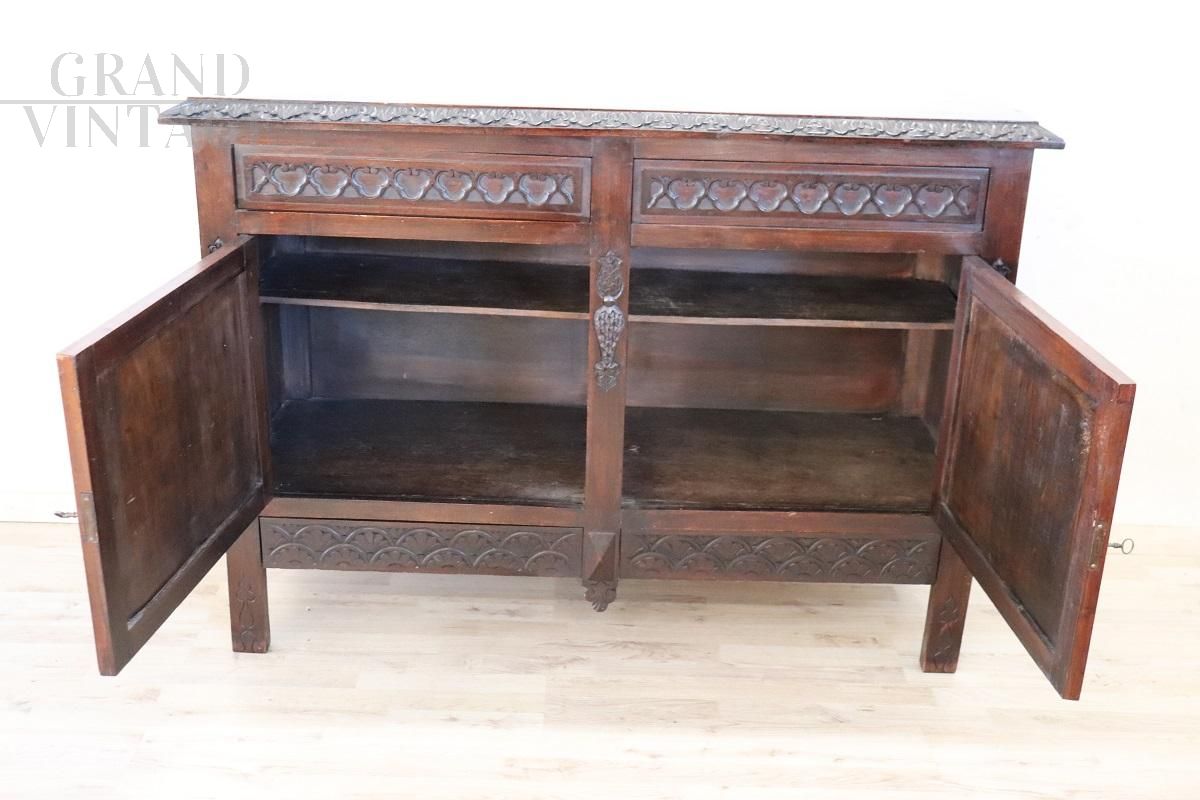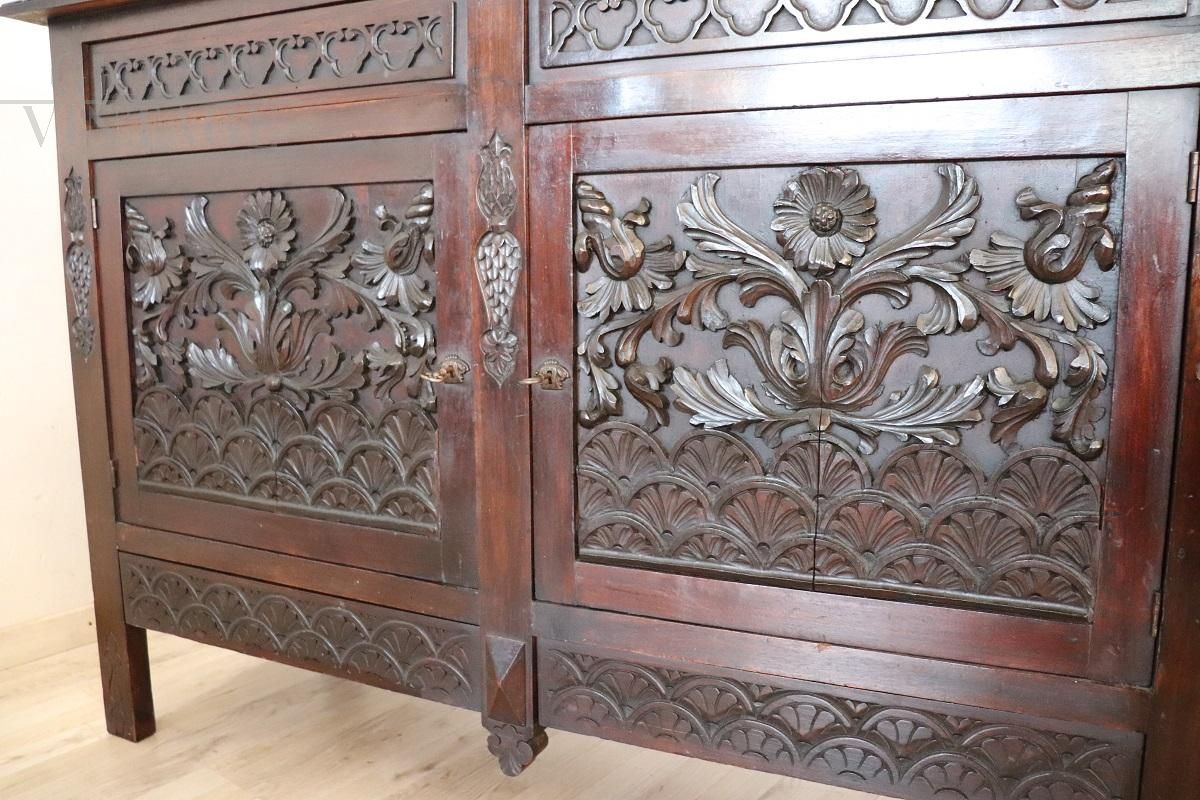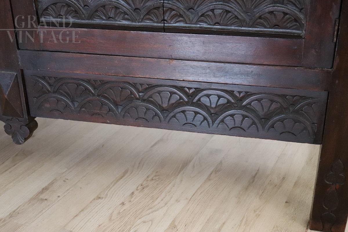Magnifica credenza madia liberty in legno di faggio finemente intagliato, risalente ai primi del Novecento. Questo mobile rappresenta un autentico capolavoro di artigianato e un esempio di ebanisteria liberty. Gli intricati decori floreali nelle ante catturano immediatamente l'attenzione, rivelando l'eccezionale maestria artigianale che ha caratterizzato la sua creazione. La credenza si distingue anche per la sua funzionalità, offrendo soluzioni di stoccaggio pratiche e ben progettate. È dotata di due cassetti superiori ideali per riporre oggetti più piccoli e di due ante magnificamente decorate che si aprono su un ampio vano, completo di ripiano interno. Ottime condizioni, prezzo trattabile.