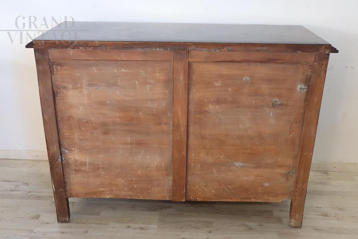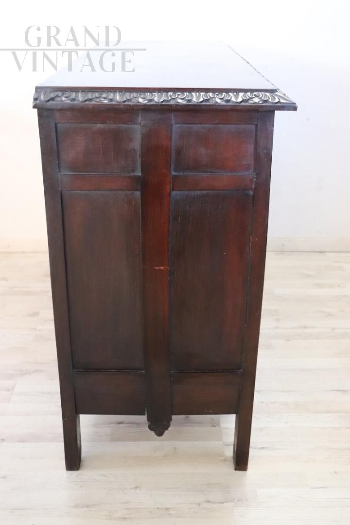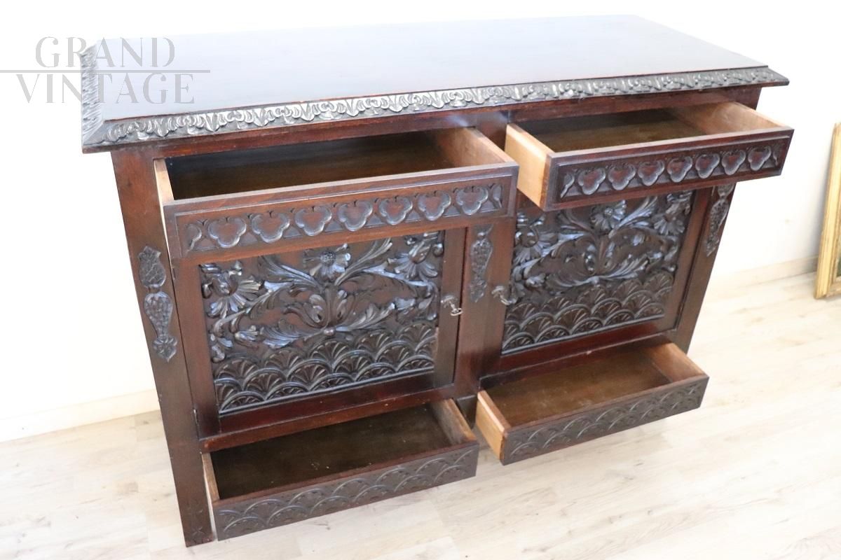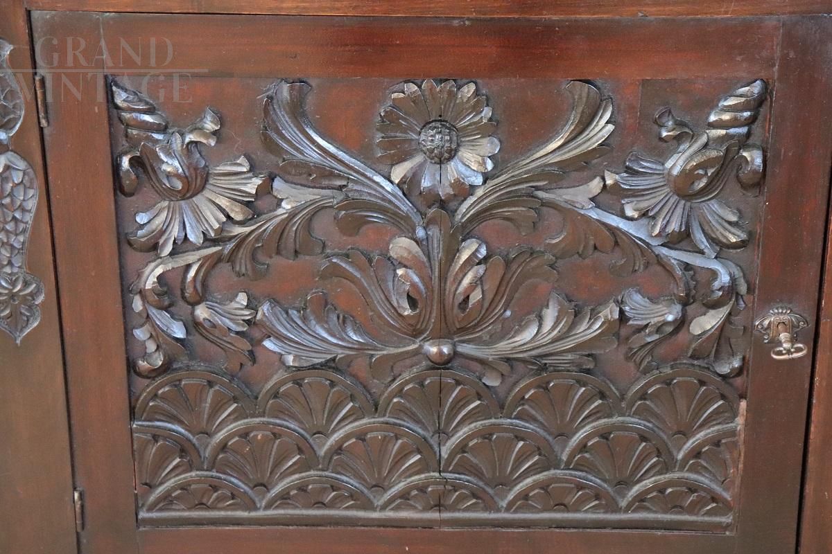 Magnifica credenza madia liberty in legno di faggio finemente intagliato, risalente ai primi del Novecento. Questo mobile rappresenta un autentico capolavoro di artigianato e un esempio di ebanisteria liberty. Gli intricati decori floreali nelle ante catturano immediatamente l'attenzione, rivelando l'eccezionale maestria artigianale che ha caratterizzato la sua creazione. La credenza si distingue anche per la sua funzionalità, offrendo soluzioni di stoccaggio pratiche e ben progettate. È dotata di due cassetti superiori ideali per riporre oggetti più piccoli e di due ante magnificamente decorate che si aprono su un ampio vano, completo di ripiano interno. Ottime condizioni, prezzo trattabile.
