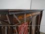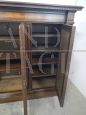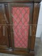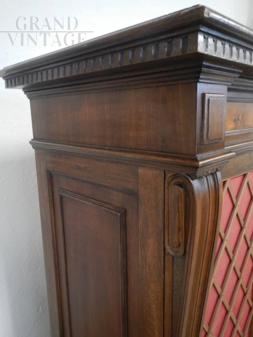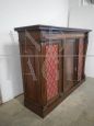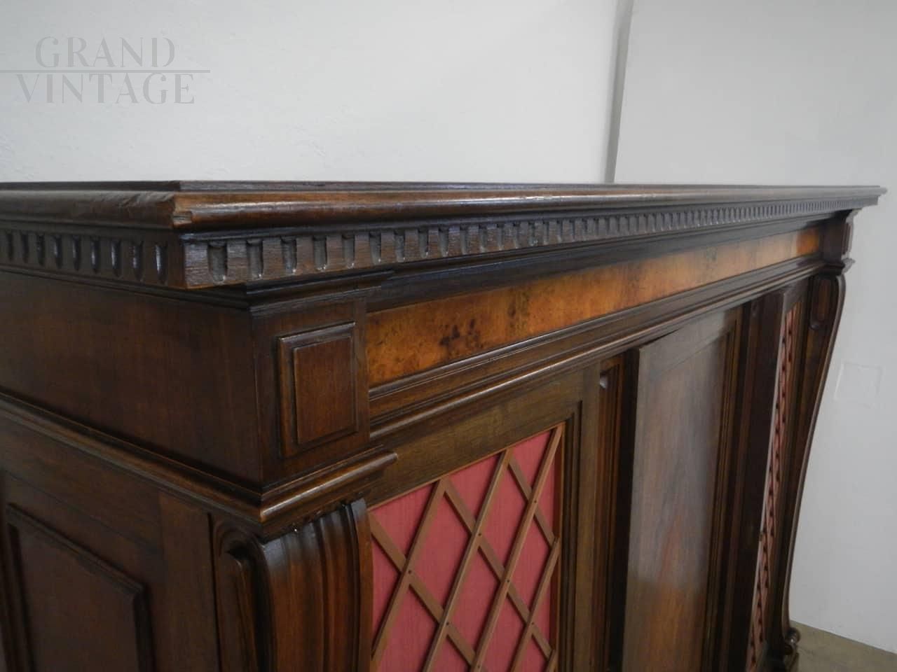 Libreria credenza vintage anni '50 in noce a tre porte rivestite in tessuto rosso scuro, con ripiani interni in abete e con chiave funzionante. Mobile non smontabile, corpo unico.