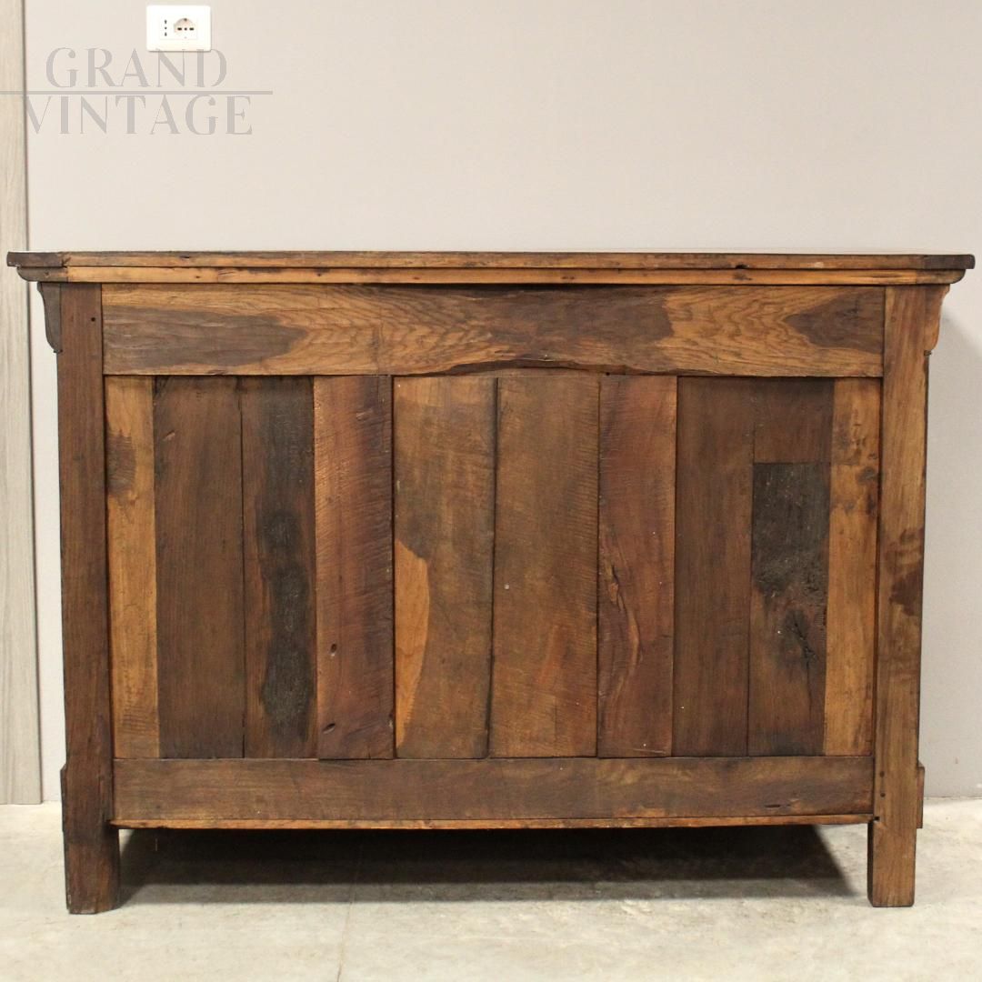Credenza cappuccina antica di epoca Luigi Filippo in noce con due ante e tre cassetti, proveniente dalla metà dell'800, restaurata.