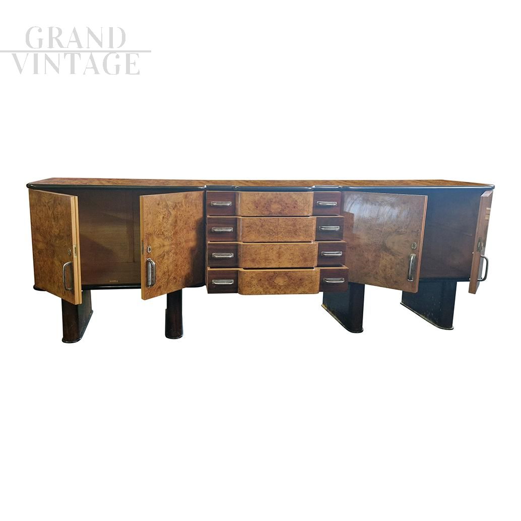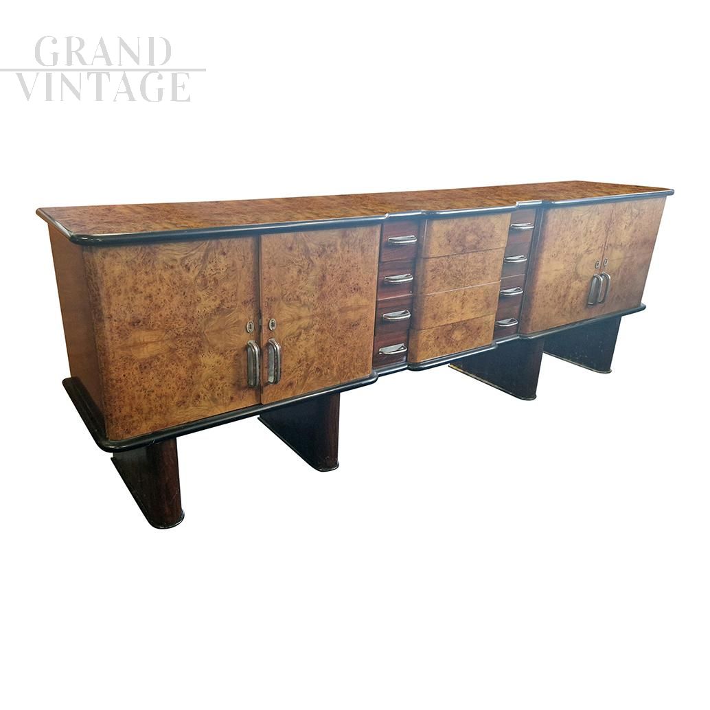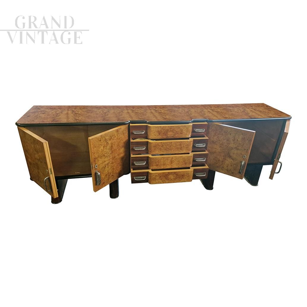Credenza lunga madia Art Déco italiana degli anni '30 caratterizzata da una linea essenziale ed elegante, realizzata in noce impiallacciato e radica di noce con profili ebanizzati. Ampio spazio utile interno con due vani esterni con quattro ante (due per lato) e quattro cassetti centrali con frontali mossi. Fantastica per impreziosire ambienti con arredi moderni e di design.