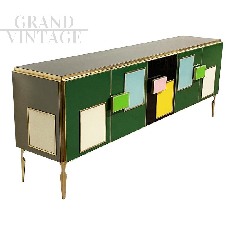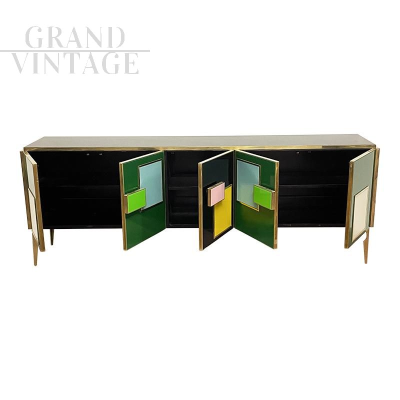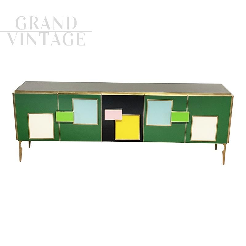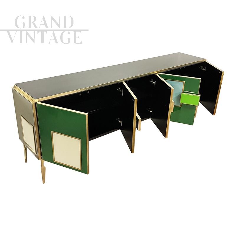 Credenza lunga madia a 5 ante interamente realizzata a mano, con struttura in legno ricoperto in vetro color verde con dettagli in vetro multicolore; profili, finiture maniglie e piedi in ottone dorato, ripiano interno.