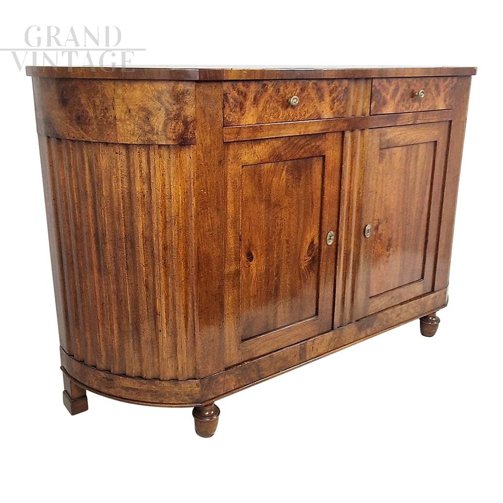 Credenza madia antica veneta di fine '700 - inizio '800 in legno di ciliegio massello con eleganti fianchi stondati e scolpiti a zigrinatura, dotata di due cassetti e due ante centrali con ripiano interno.