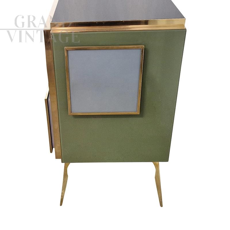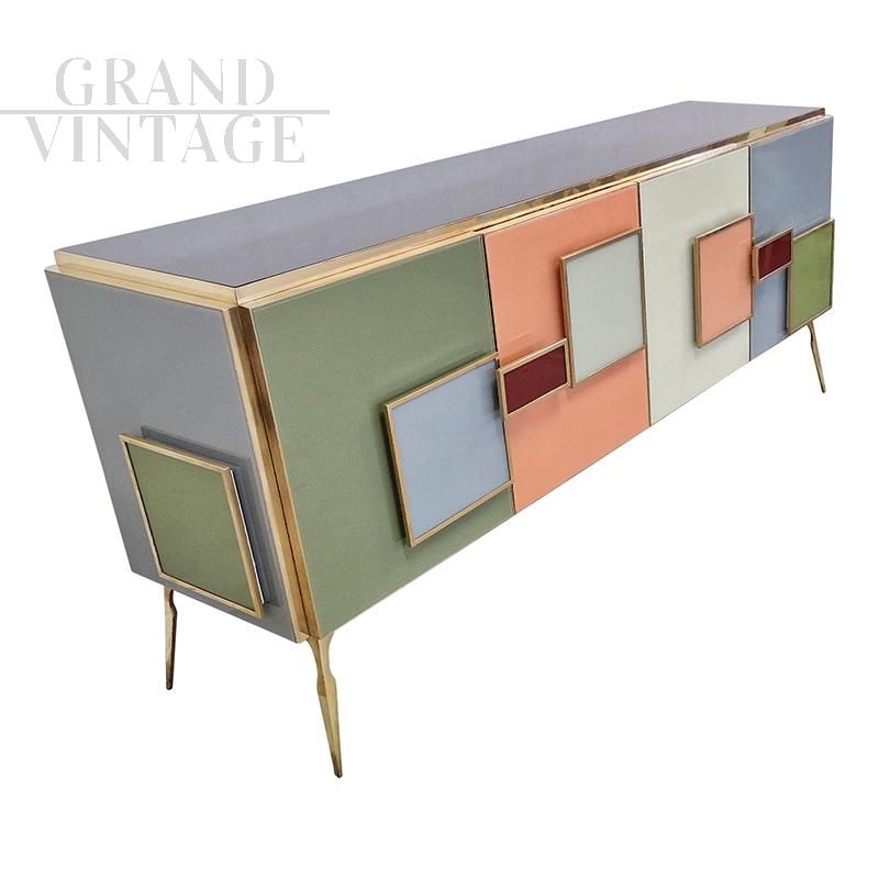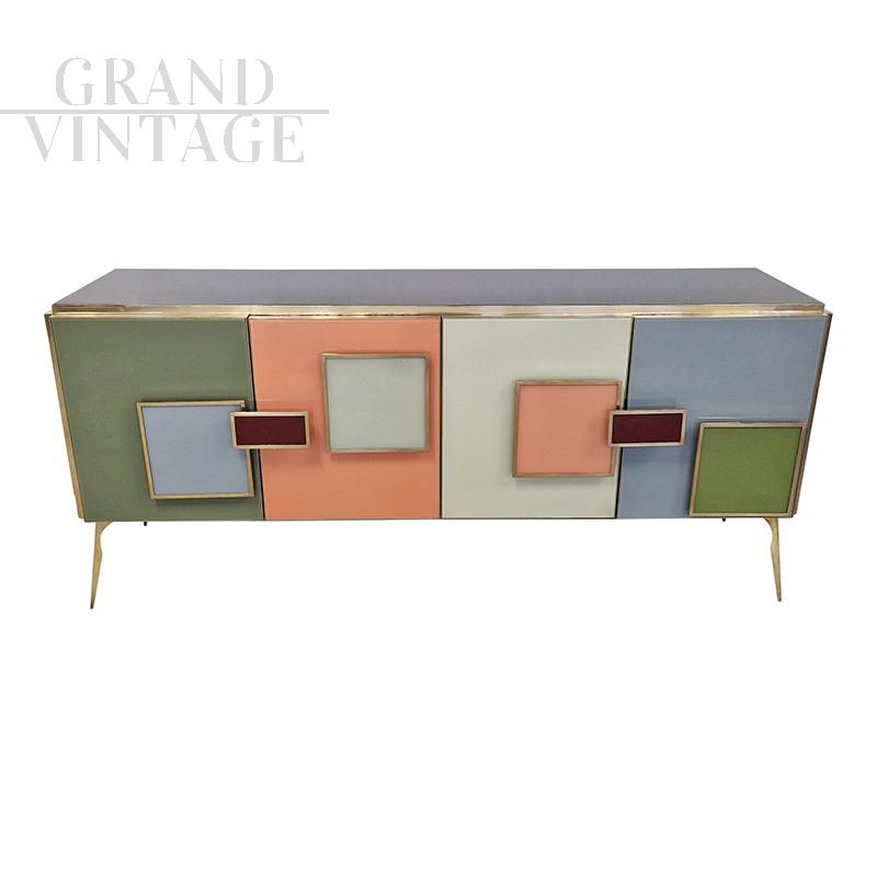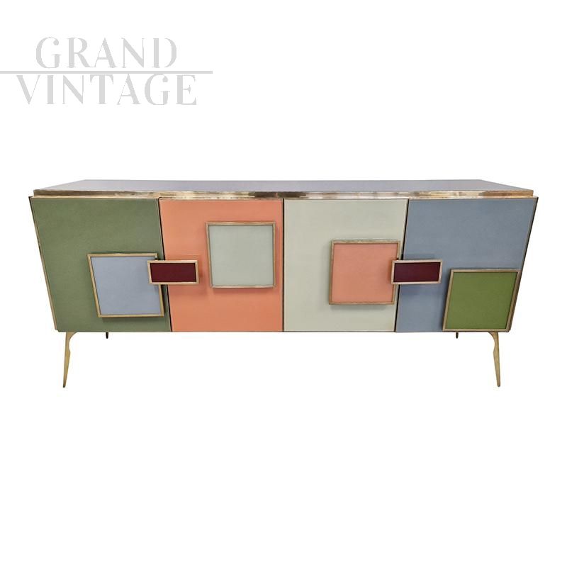 Credenza design a quattro ante con ripiano interno, interamente realizzata a mano, con struttura in legno rivestita in vetro colorato in toni pastello. Profili e piedi in ottone dorato. Maniglie quadrate colorate.