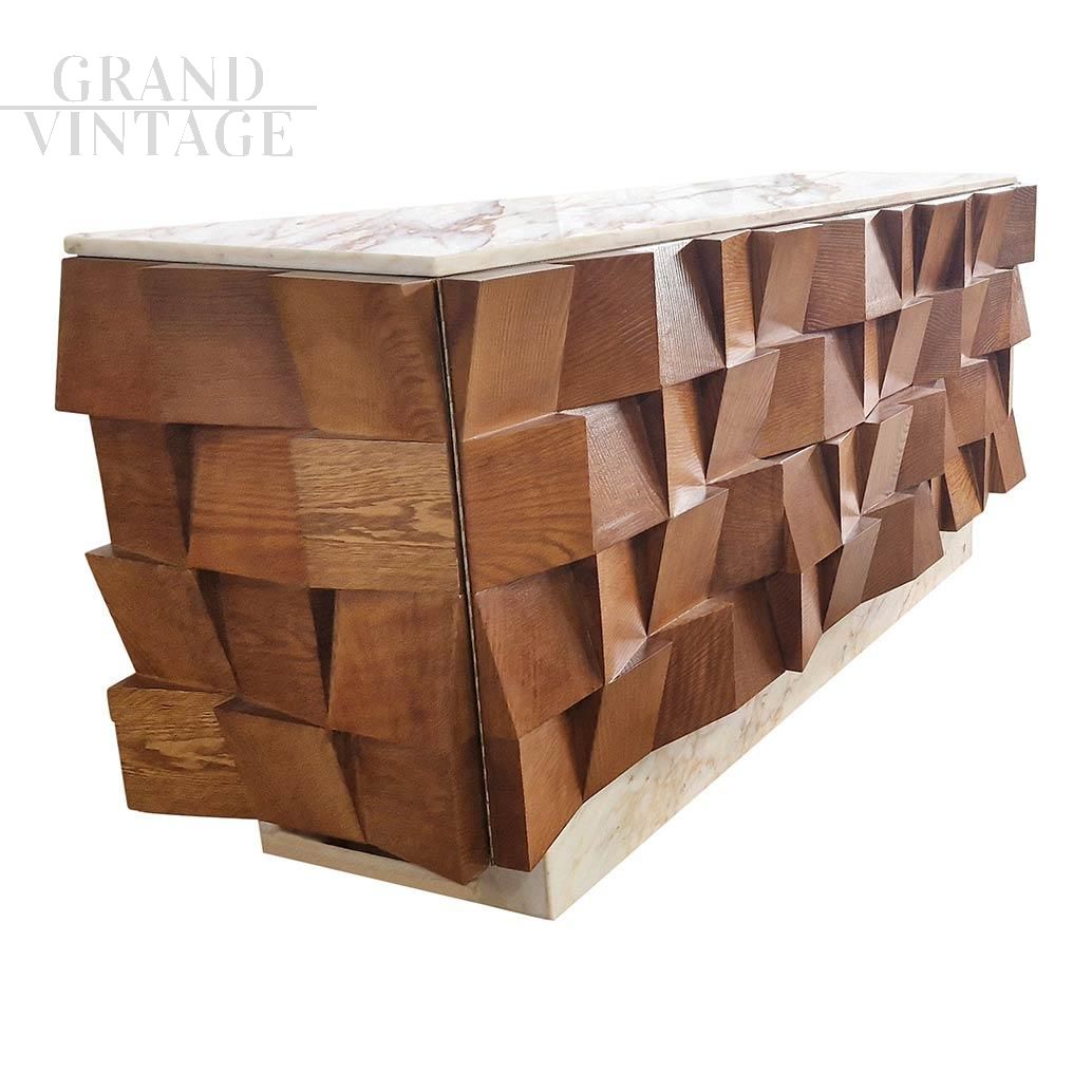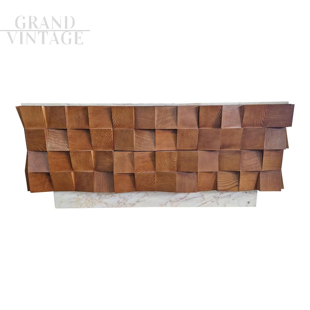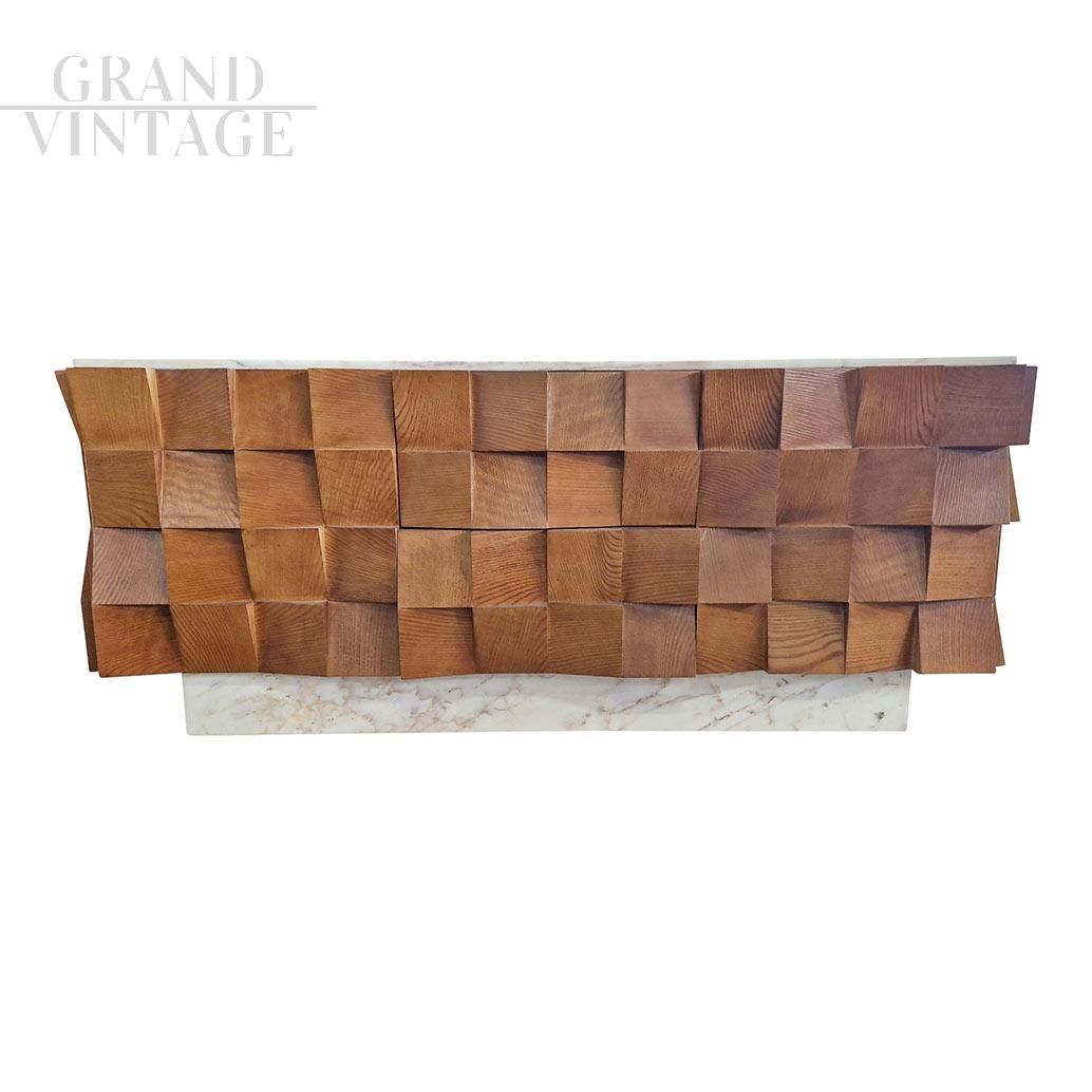 Particolare credenza vintage italiana, composta da due ante a libro e due cassetti centrali, realizzata con struttura in legno massello di noce. Il design molto particolare della parte superiore delle ante centrali, dei frontali dei cassetti e dei fianchi è caratterizzato da numerosi riquadri di legno combinati insieme a diverse angolazioni per mostrare la consistenza e la profondità spaziale. La parte superiore della credenza e la base rettangolare che la sostiene sono rivestiti di marmo Bianco Carrara. Realizzata in Italia tra gli anni '70 e '80.