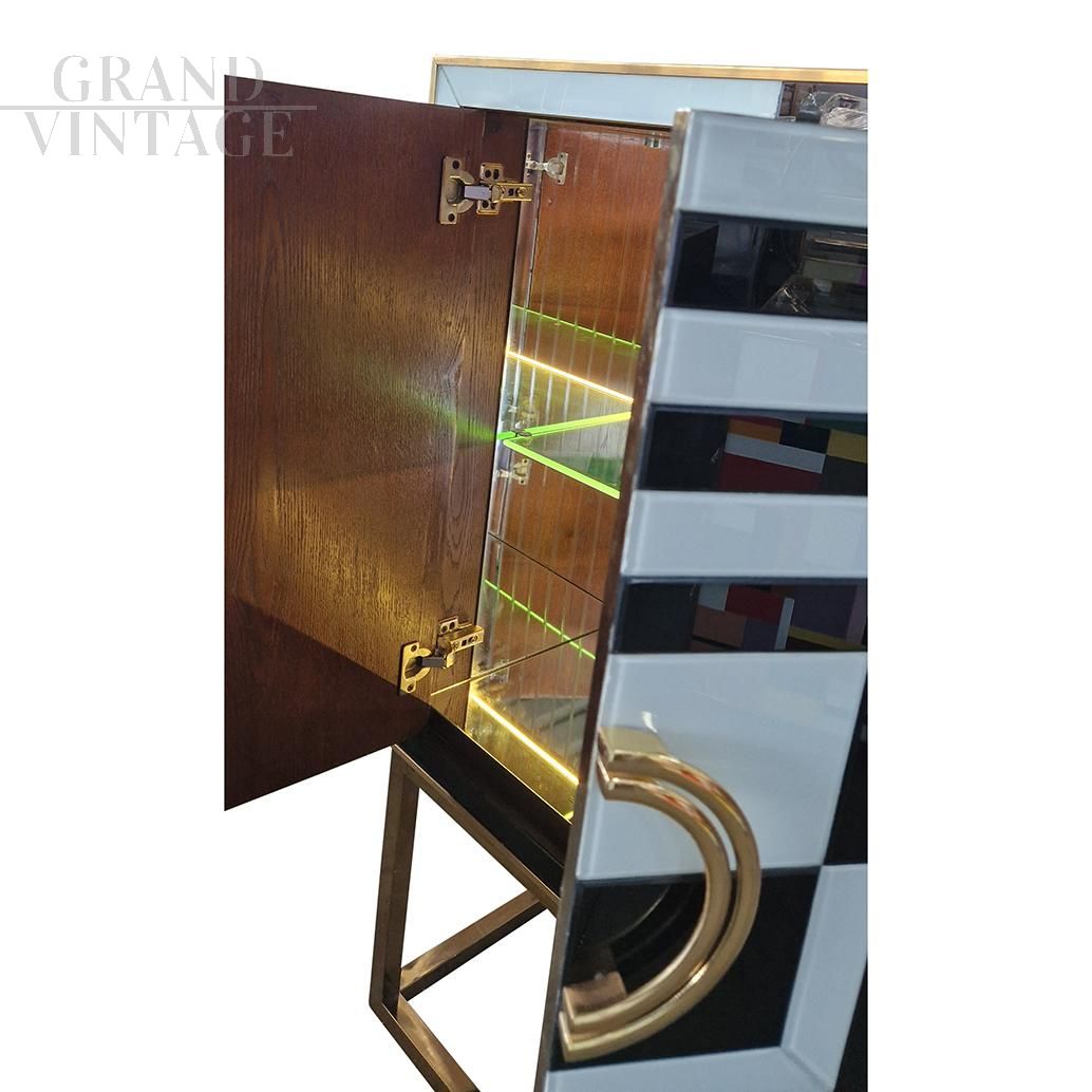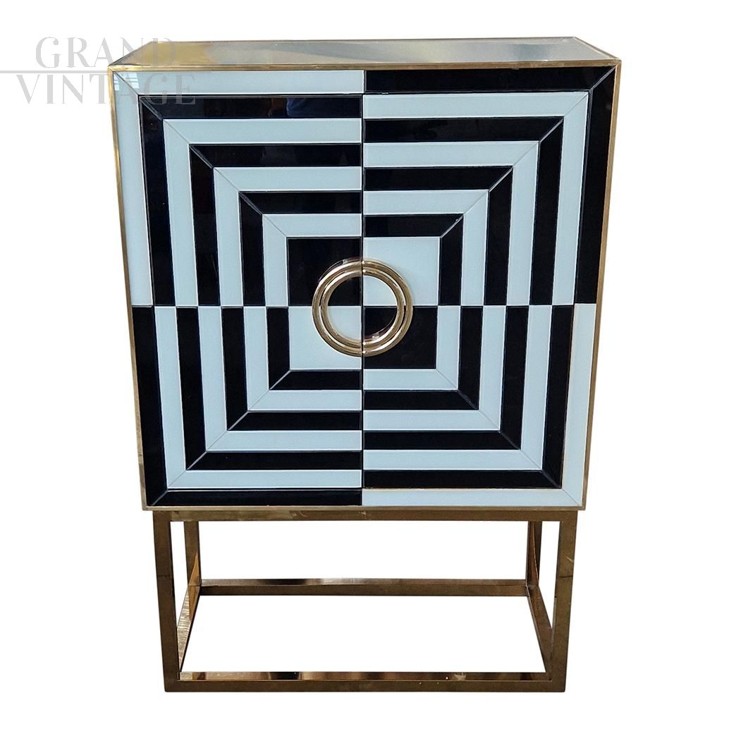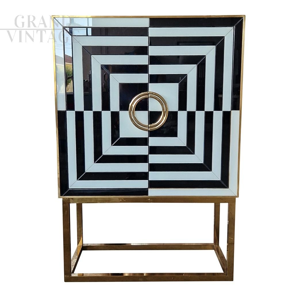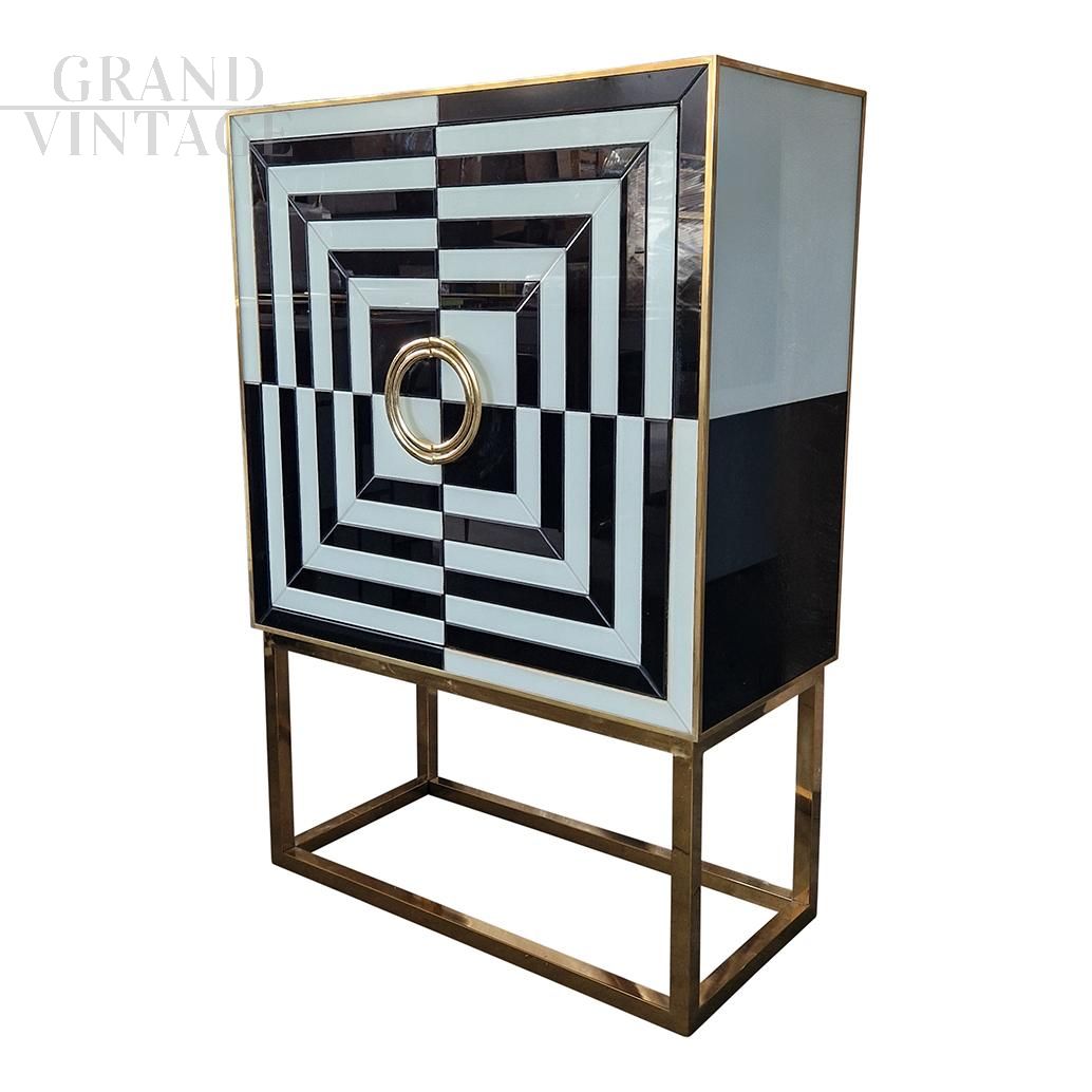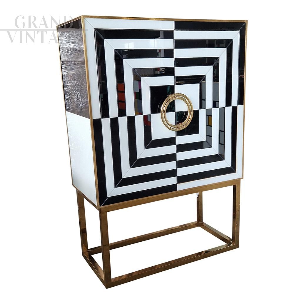 Credenza mobile bar interamente realizzata a mano in legno rivestito in vetro bianco e nero con un bellissimo effetto optical, interno specchiato illuminato. Ante con profili in acciaio dorato e ripiano interno in vetro, maniglie in ottone e struttura tubolare in ottone dorato.