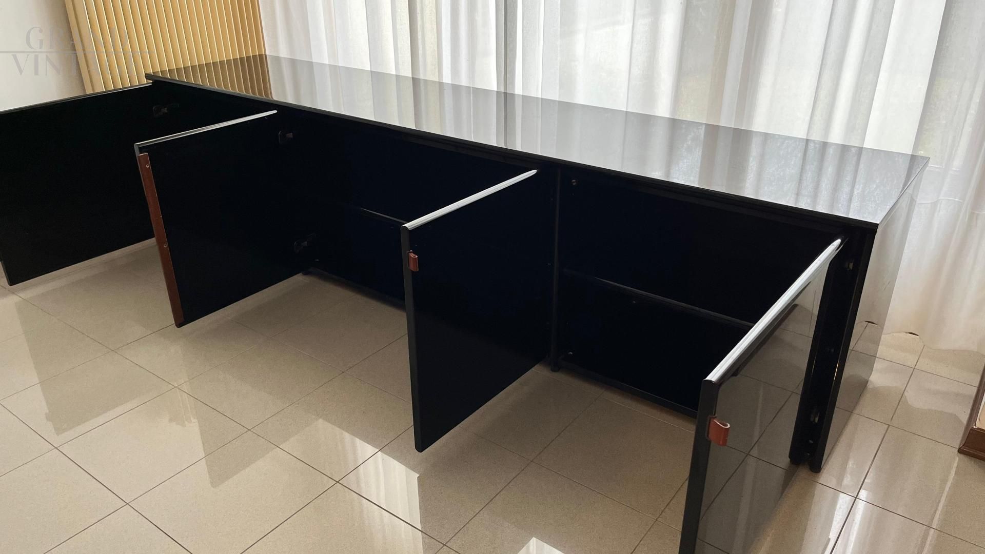 Grande credenza Mou di Afra & Tobia Scarpa per Molteni in legno laccato nero lucido a specchio sul fronte e sul retro, e anche internamente, dotato di maniglie in cuoio e quattro ante, usata con qualche graffio che si vede in controluce, ma si può lucidare.
