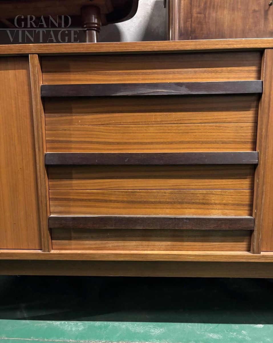 Credenza sideboard vintage scandinava in legno teak con 4 antine e 3 cassetti, con elementi in legno scuro.