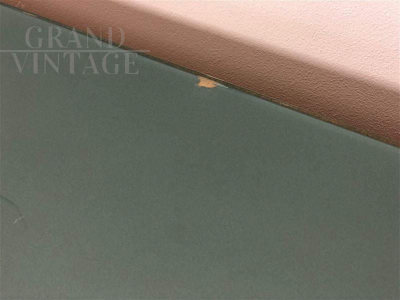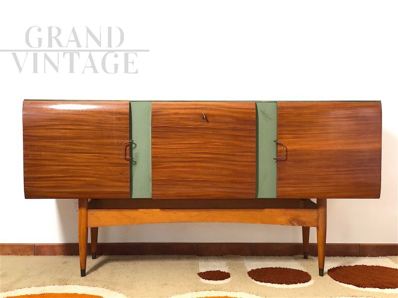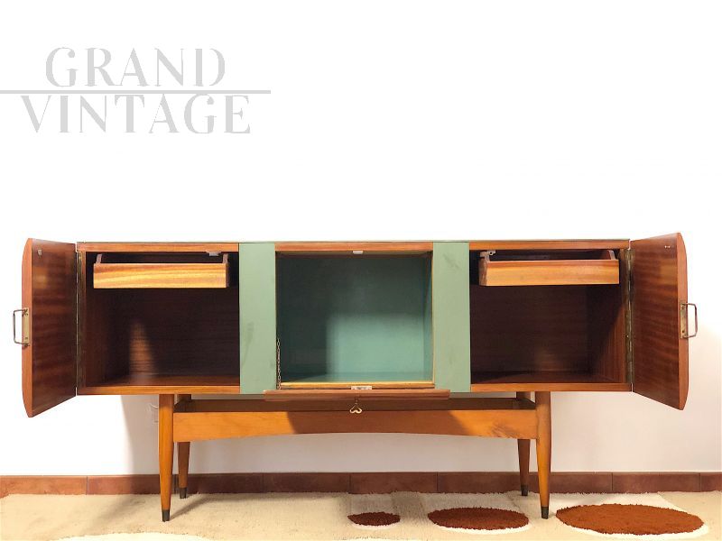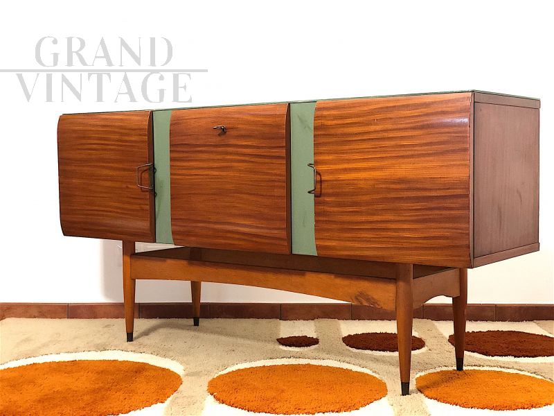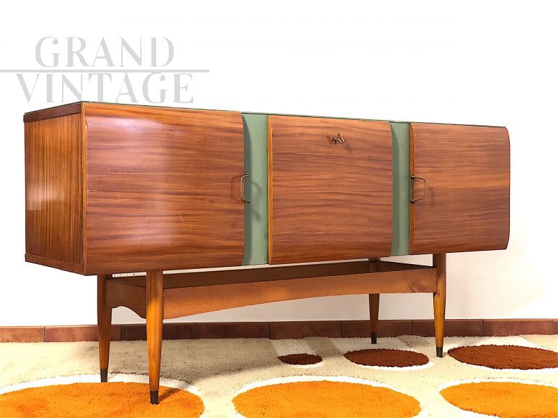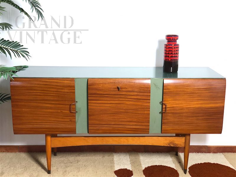 Credenza sideboard vintage anni '60 di manifattura Italiana ma di gusto scandinavo, con struttura in legno massello di faggio e piano in vetro satinato di colore verde salvia, maniglie in ottone, gambe con puntali in ottone. Il sideboard presenta 2 vani con sportelli e relativo cassetto interno, un vano con anta a ribalta e rivestimento interno in vetro. La linea strutturale asimmetrica è decisamente futuristica per i canoni degli anni '60. Completamente restaurato e in perfette condizioni.