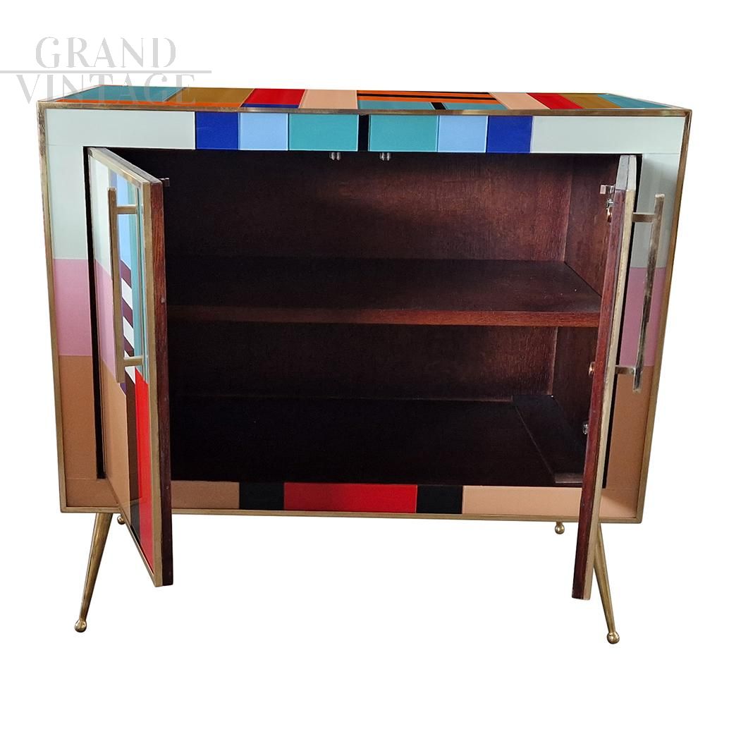 Credenza design in stile vintage in legno rivestito con tessere in vetro di Murano multicolore, dotata di due ante e interamente realizzata a mano; profili, maniglie e piedi in ottone dorato, ripiano interno in legno.