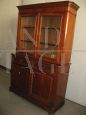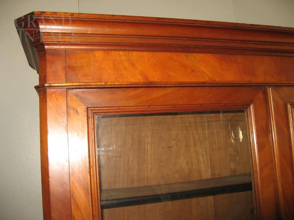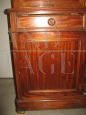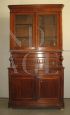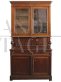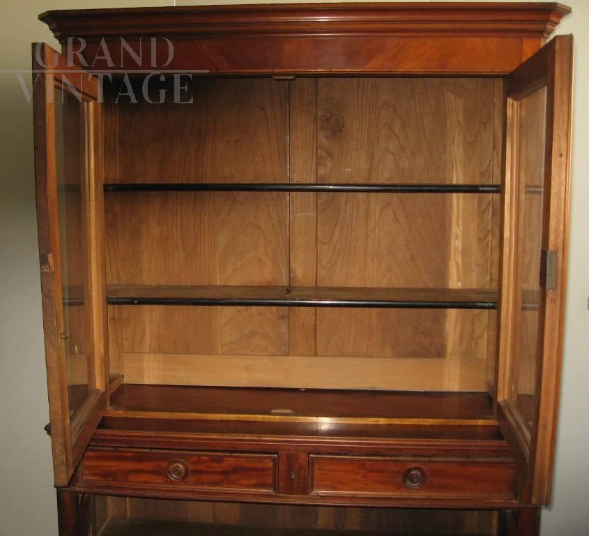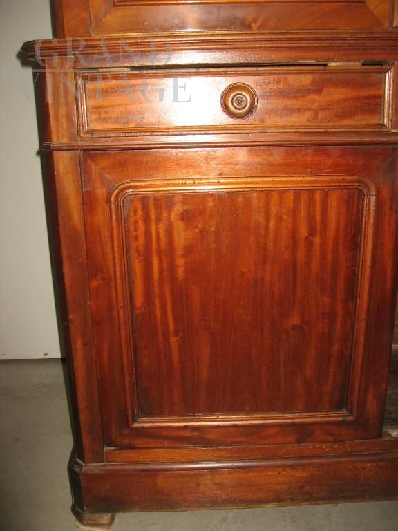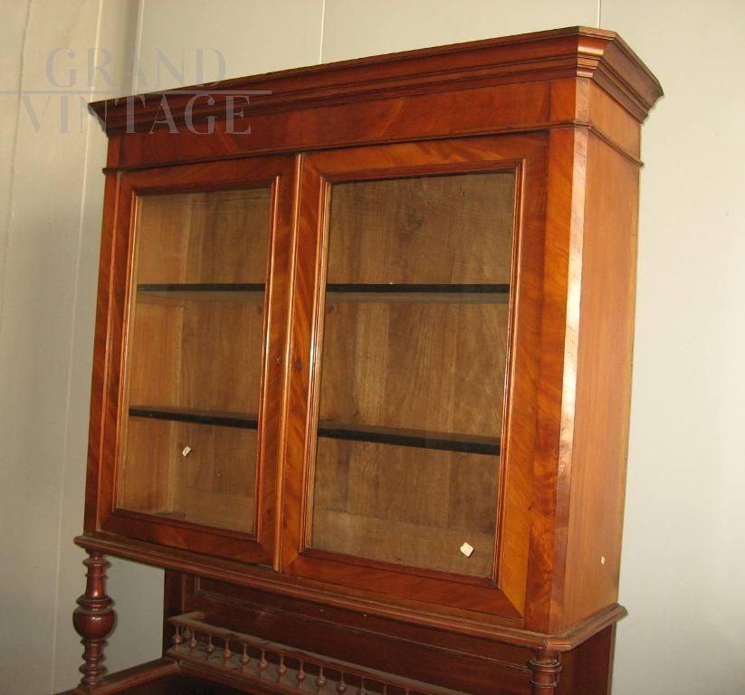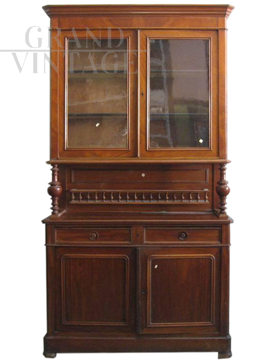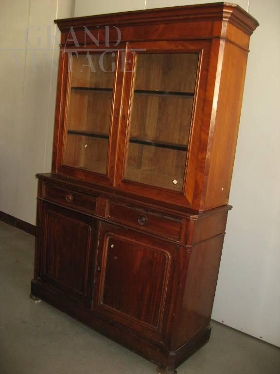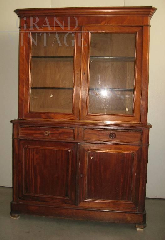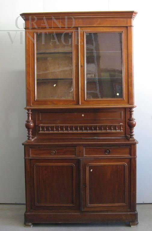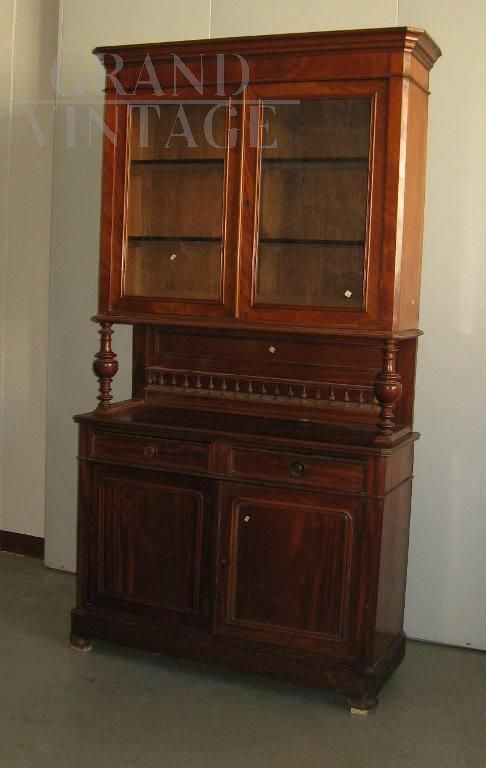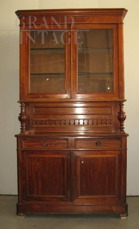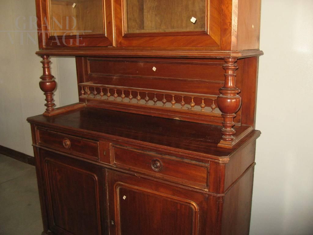 Credenza antica a due corpi degli inizi del '900 con alzata a vetri, impiallacciata mogano. Epoca primi del '900, provenienza Francese. La parte inferiore è composta da due ante e due cassetti, la superiore da due ante a vetri. Dotata anche di uno stacco al centro, uno spazio tra i due corpi, che si può inserire oppure no. Non restaurata, necessita di restauro per essere utilizzata.