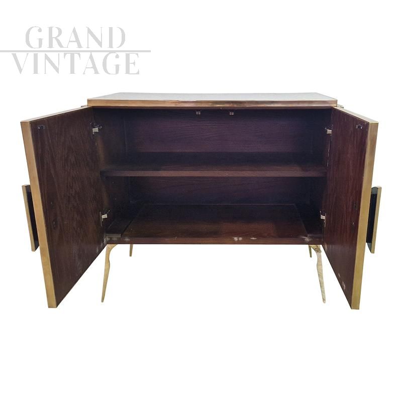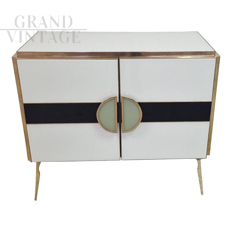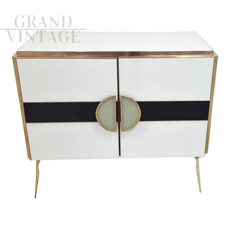 Credenzina a due ante interamente realizzata a mano, con struttura in legno rivestito in vetro bianco con fascia orizzontale nera, profili e piedi in ottone dorato. Maniglie a mezzaluna verdi, ripiano interno.