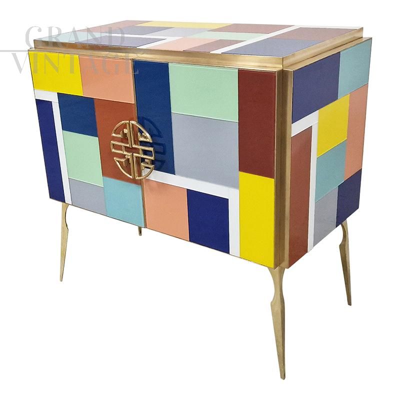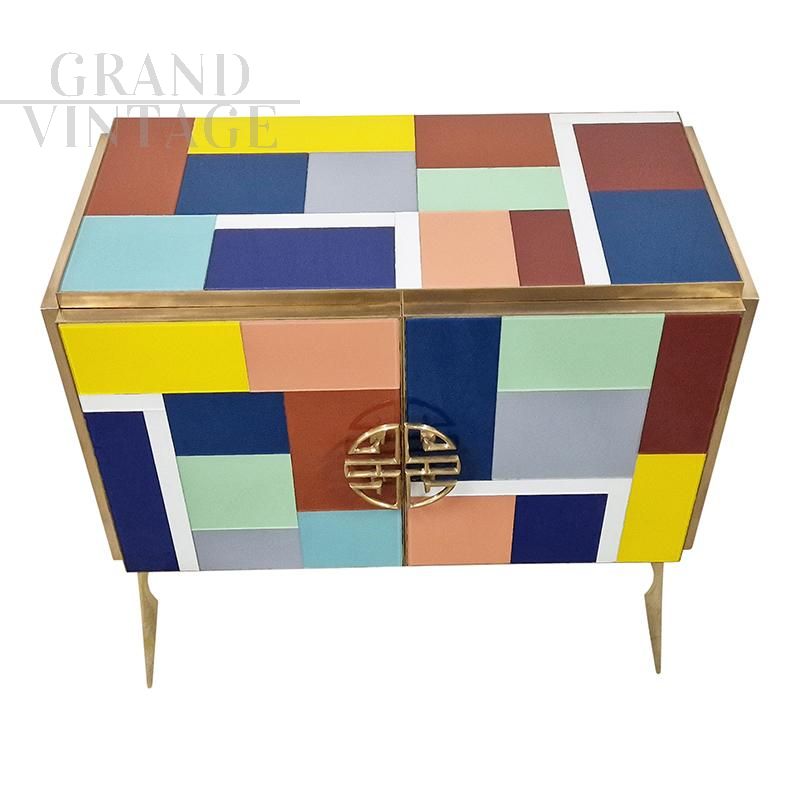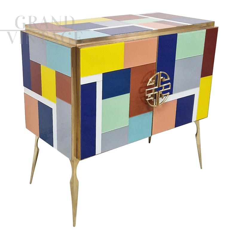 Credenza design a due ante con ripiano interno, interamente realizzata a mano, con struttura in legno rivestita in vetro colorato. Profili, maniglie e piedi in ottone dorato.