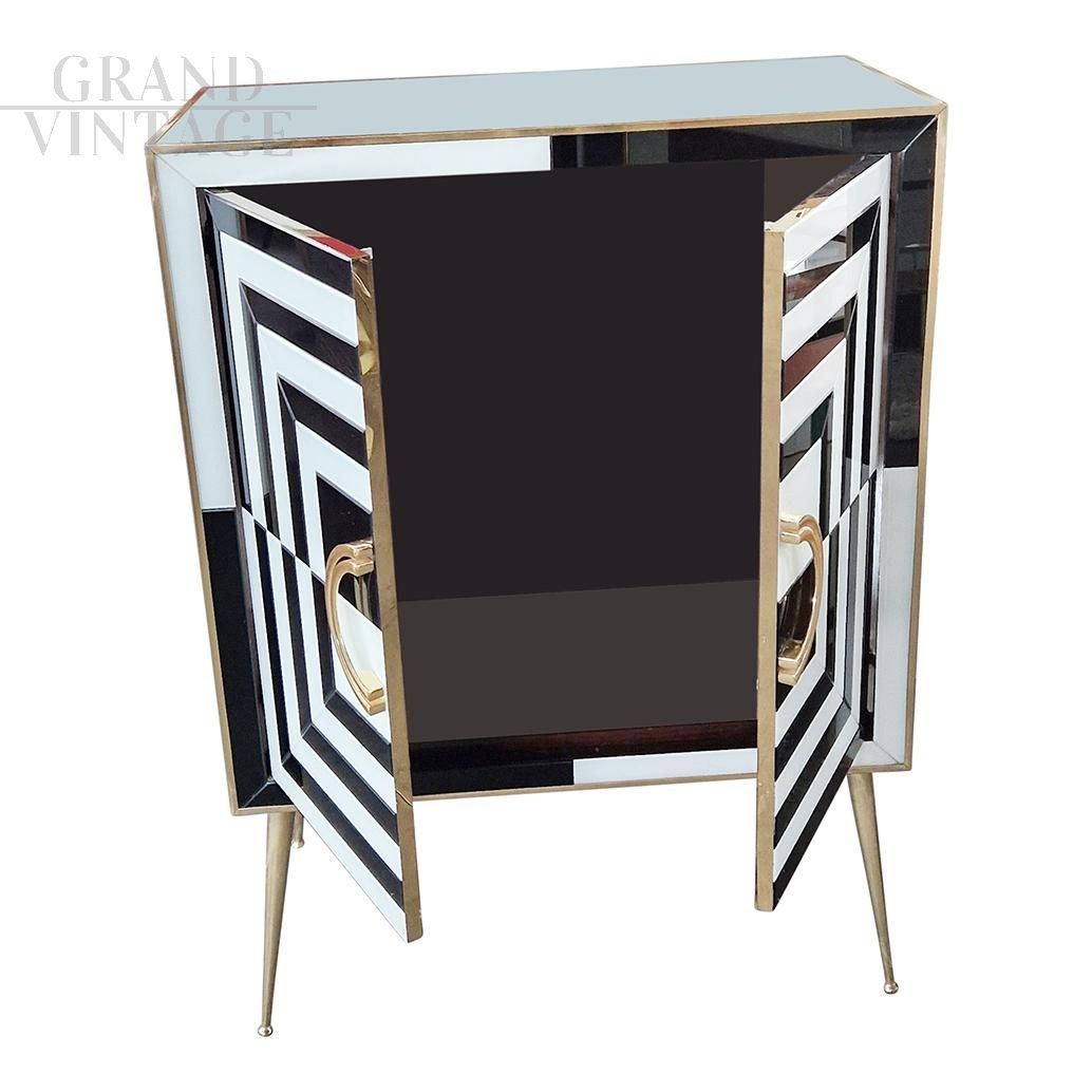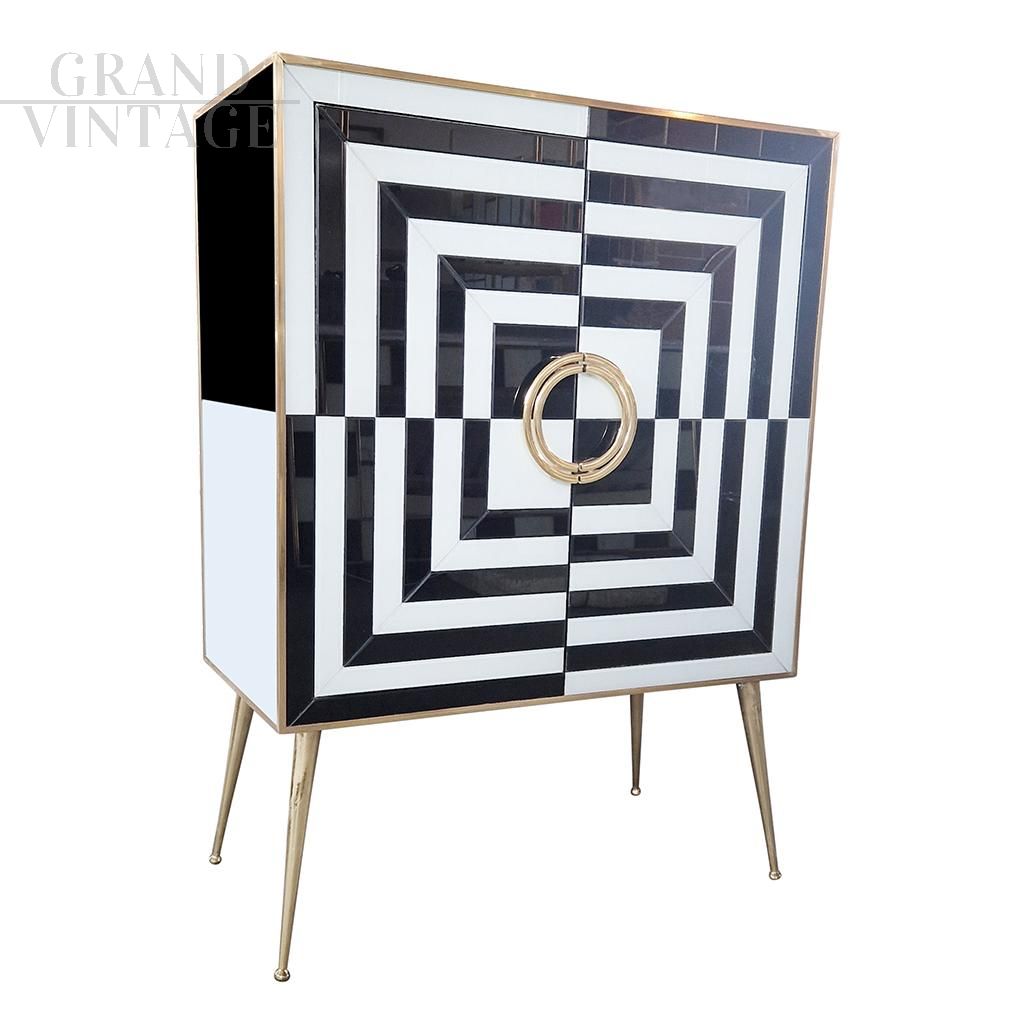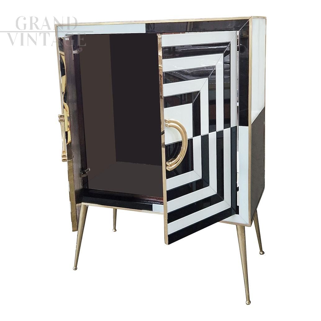 Piccola credenza mobile bar interamente realizzata a mano in legno rivestito in vetro bianco e nero con un bellissimo effetto optical, interno specchiato illuminato. Ante con profili in acciaio dorato e ripiano interno in vetro, maniglie e piedi in ottone.