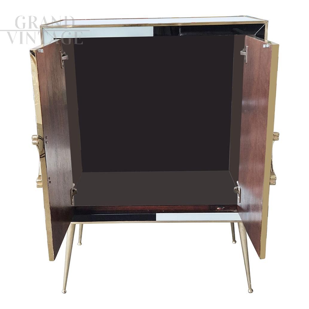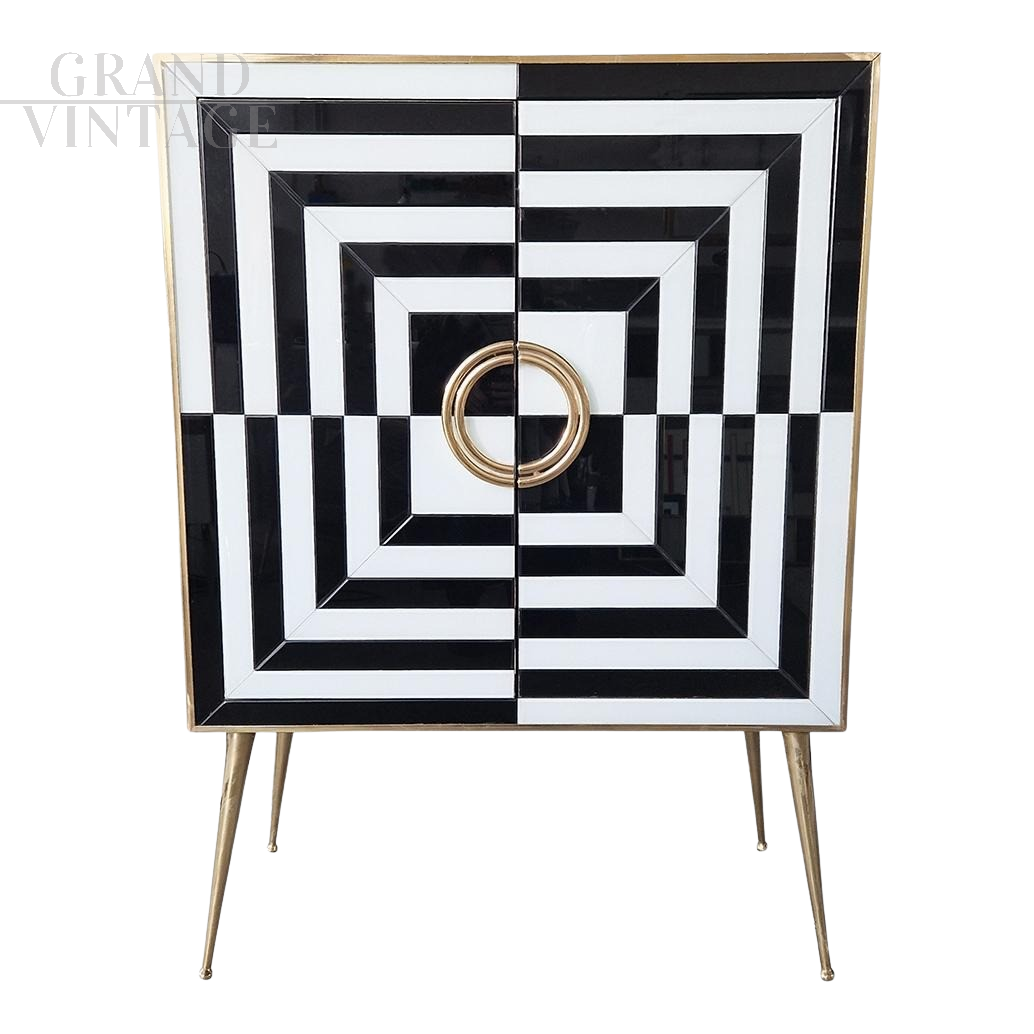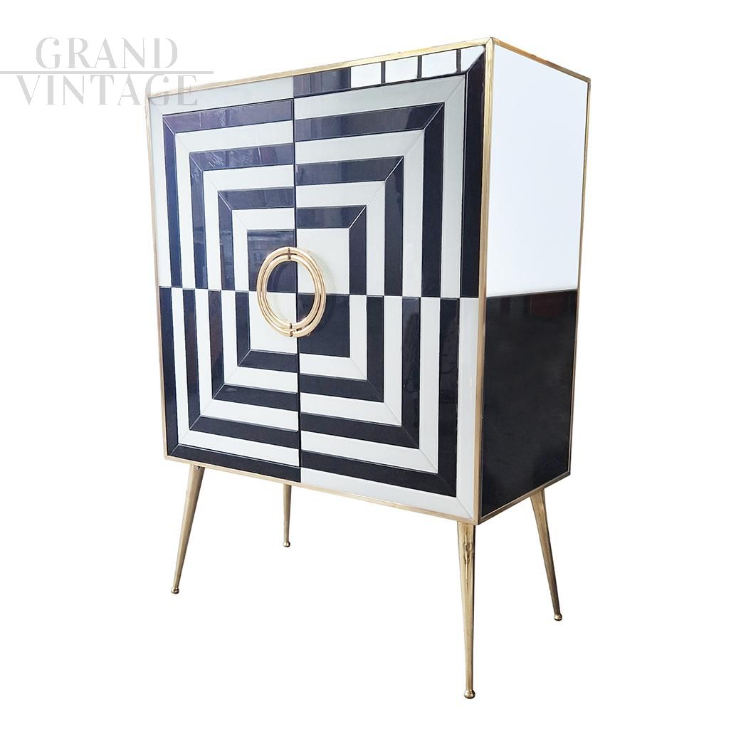 Piccola credenza mobile bar interamente realizzata a mano in legno rivestito in vetro bianco e nero con un bellissimo effetto optical, interno specchiato illuminato. Ante con profili in acciaio dorato e ripiano interno in vetro, maniglie e piedi in ottone.