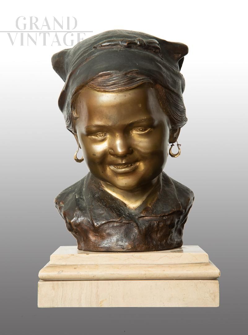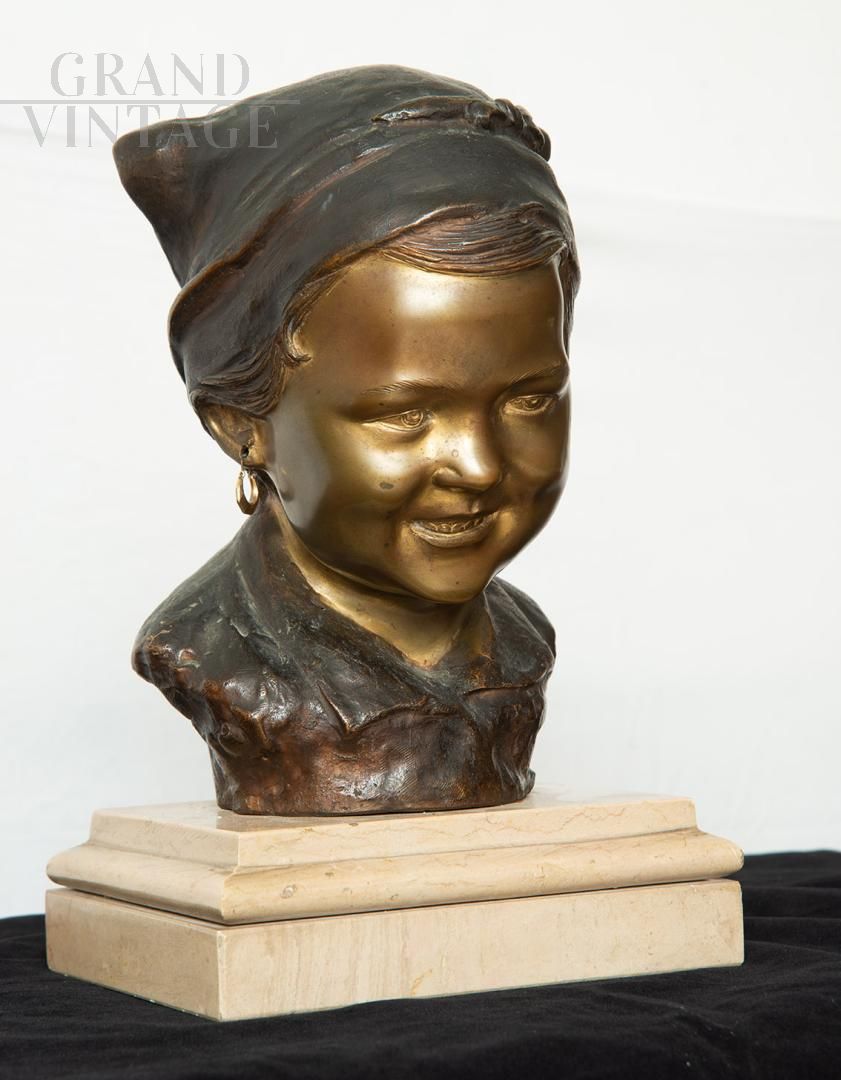 Scultura antica in bronzo brunito raffigurante testa di giovane contadina, firmata De Martino.