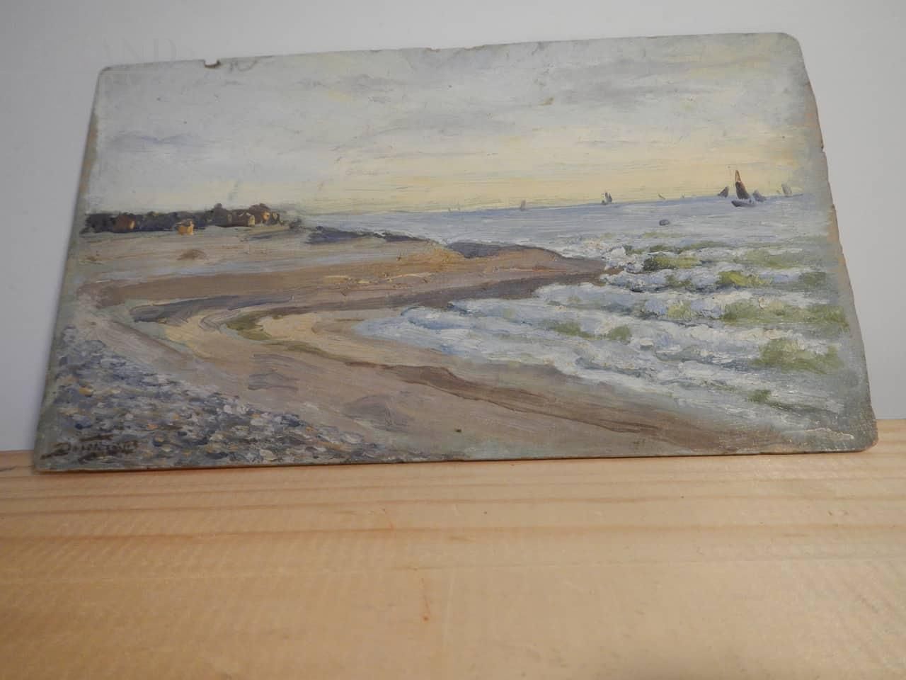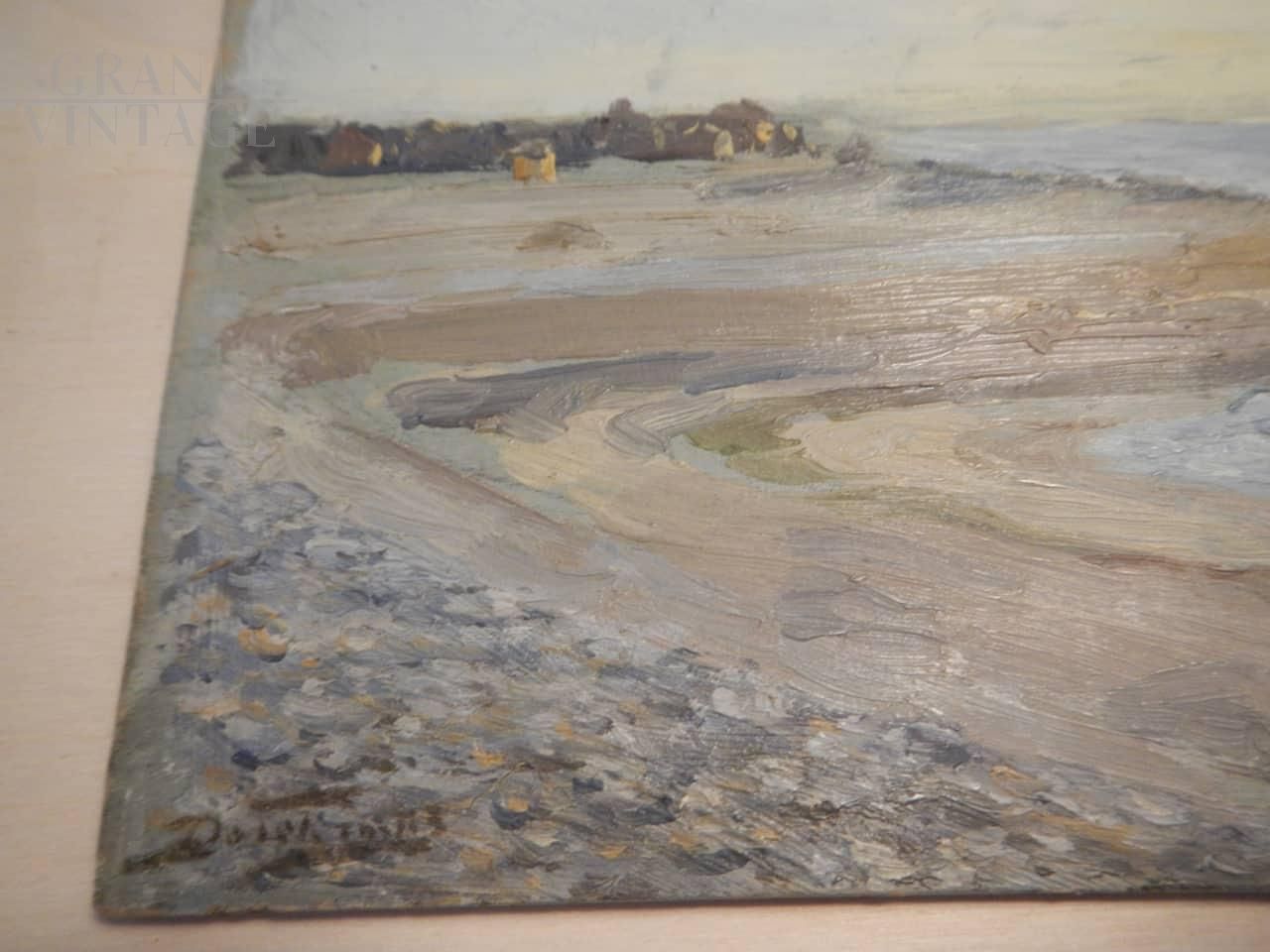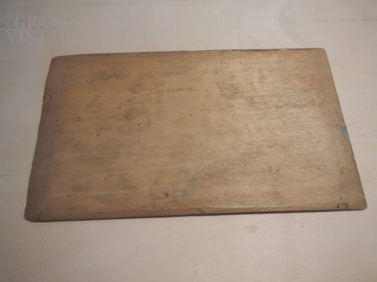 Dipinto di pittore francese Deschamps con soggetto una spiaggia di Caienna, nell'oceano della Guyana. L'opera è realizzata ad olio su tavola, nello specifico sul coperchio di una scatola di colori, tra la fine del 19° secolo e l'inizio del 20° secolo. Firmato sul retro.