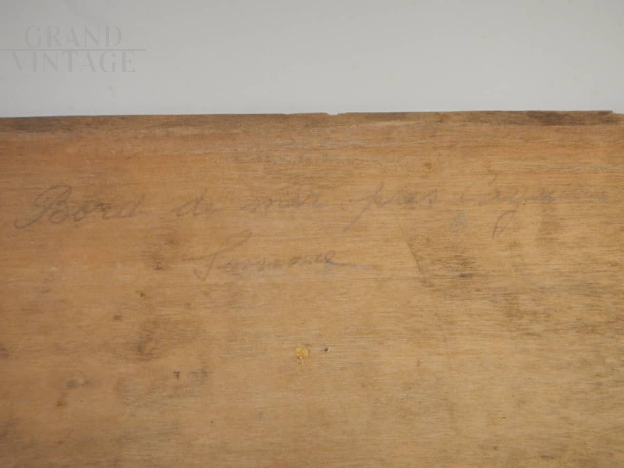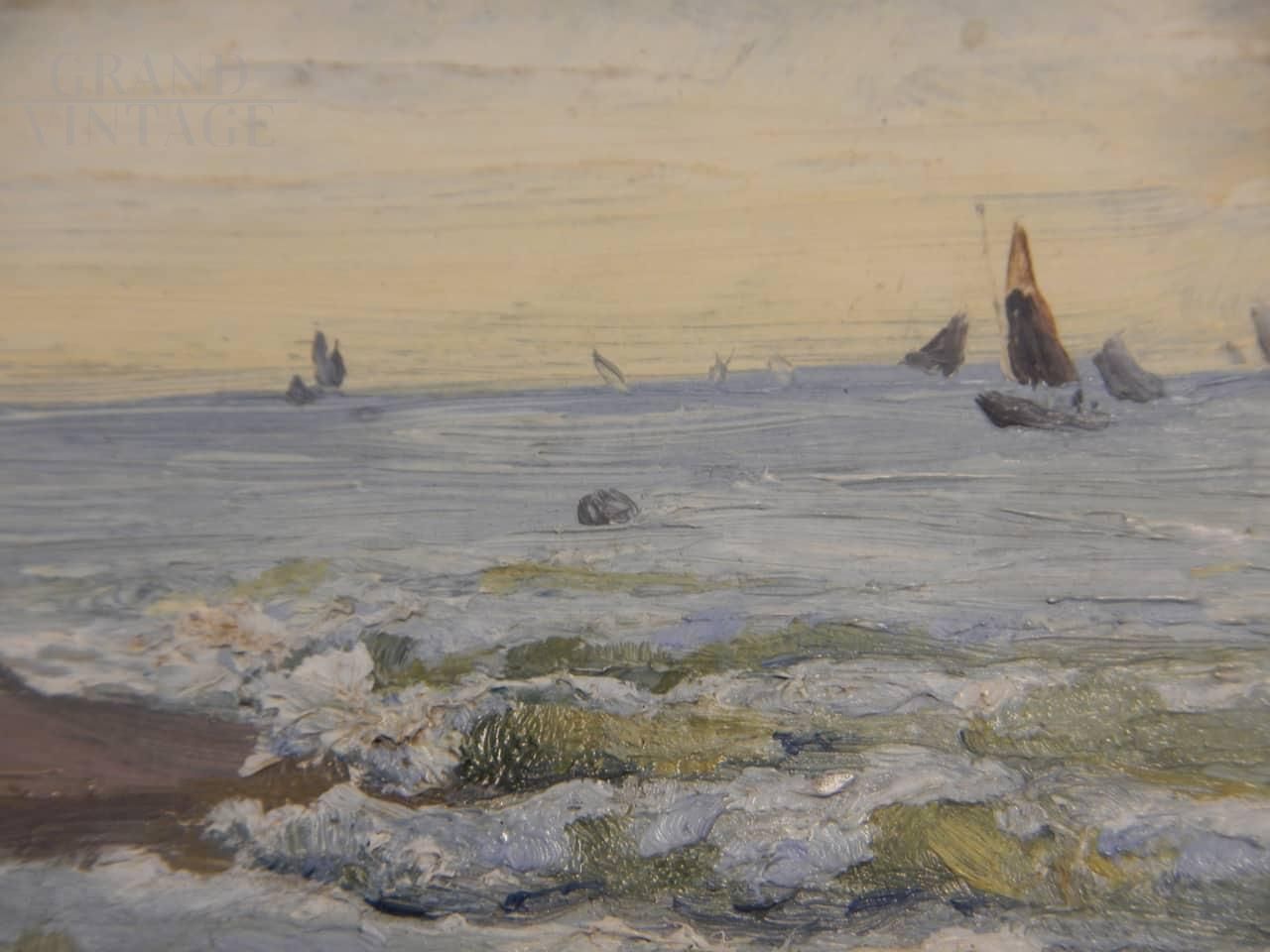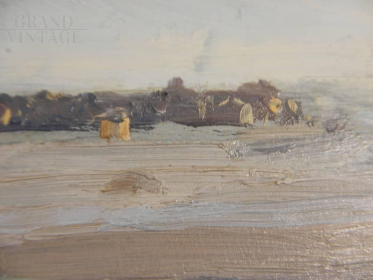 Dipinto di pittore francese Deschamps con soggetto una spiaggia di Caienna, nell'oceano della Guyana. L'opera è realizzata ad olio su tavola, nello specifico sul coperchio di una scatola di colori, tra la fine del 19° secolo e l'inizio del 20° secolo. Firmato sul retro.