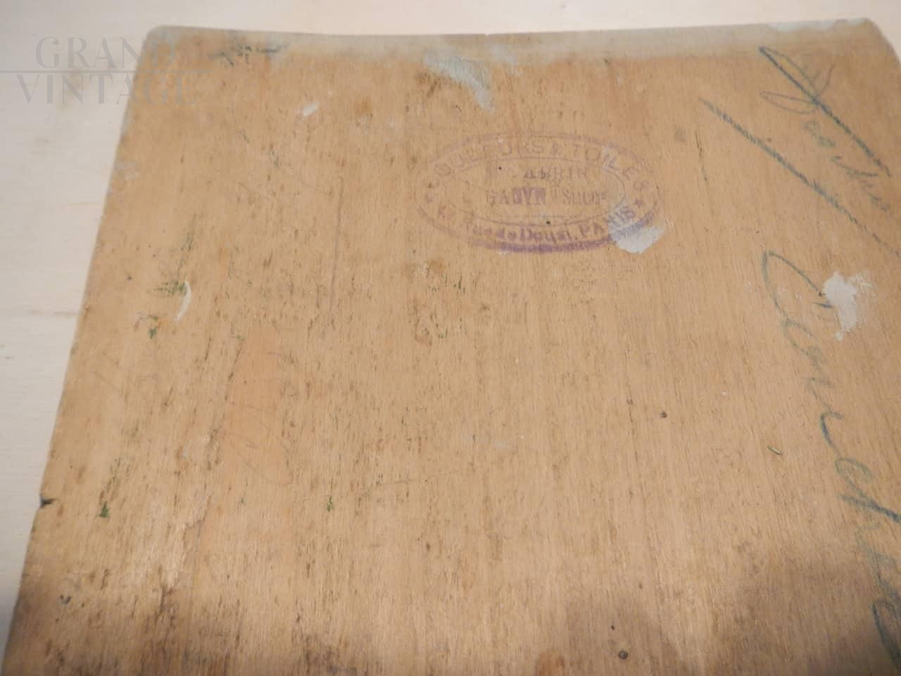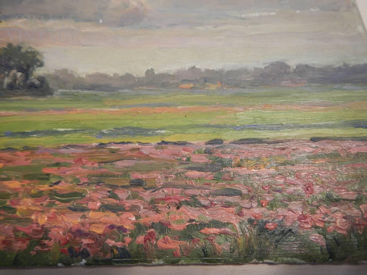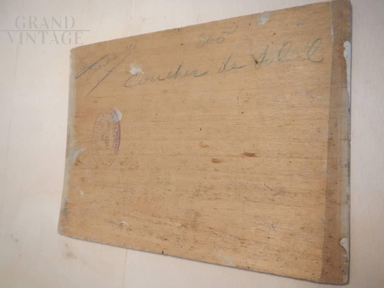 Dipinto del pittore francese Deschamps con tramonto su un bellissimo prato primaverile. L'opera è stata realizzata ad olio su tavola, nello specifico sul coperchio di una scatola di colori che riporta ancora il marchio di produzione, ed è titolato e firmato sul retro. Databile tra la fine del 19° secolo e l'inizio del 20° secolo.