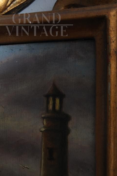Dipinto anni '40 raffigurante marina con faro, firmato