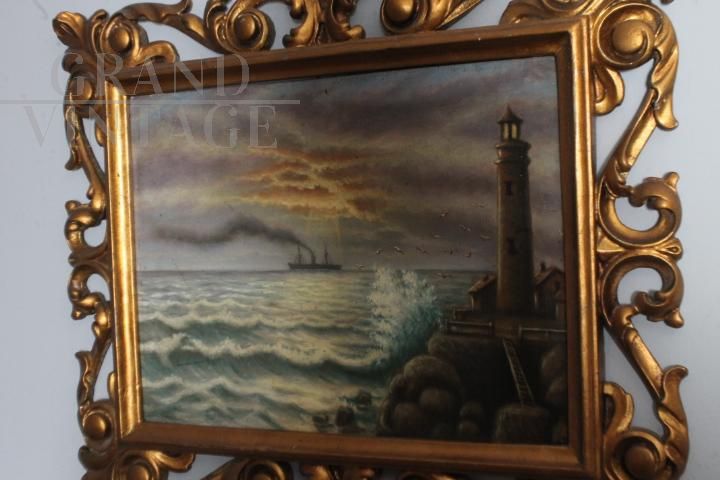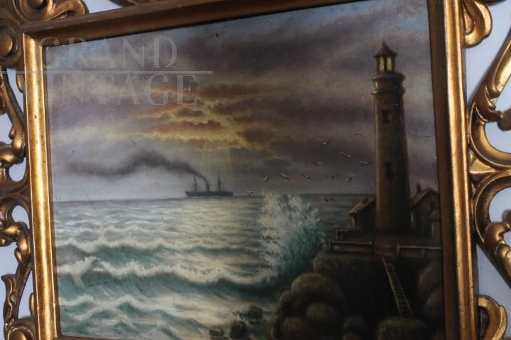 Dipinto olio su tavola raffigurante marina con faro e una nave all'orizzonte colpita da un fascio di luce che filtra dalle nuvole, titolato, datato e firmato sul retro New Port 1940, Sean Glass, completo di cornice dorata finemente intagliata. Non necessita di alcun intervento.