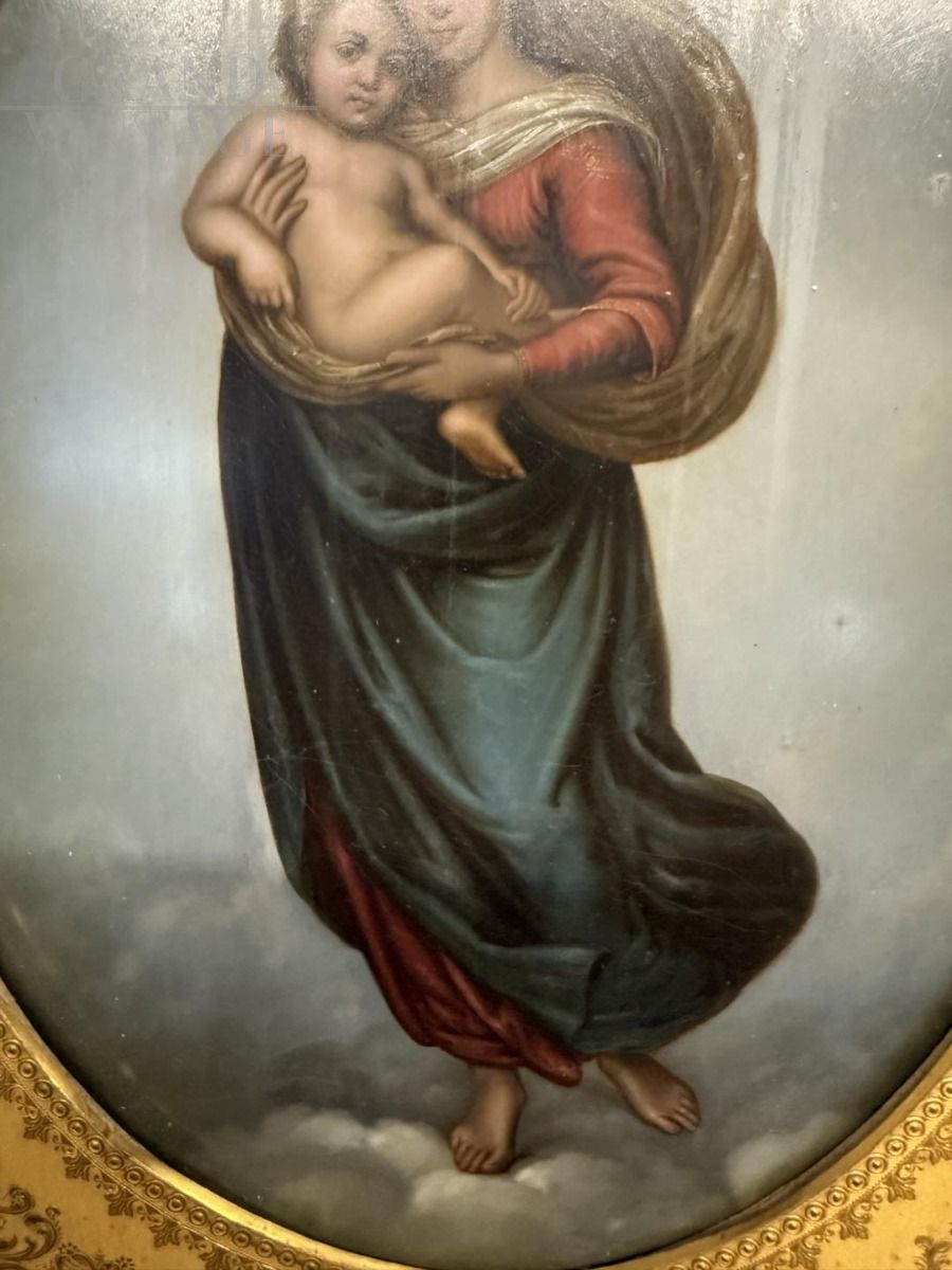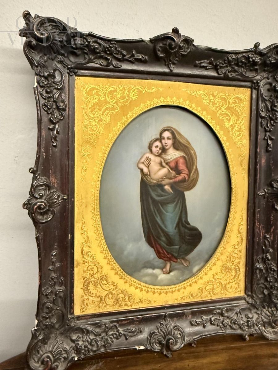 Magnifico dipinto antico olio su rame raffigurante la Madonna di San Sisto col Bambino in braccio, realizzato verso la fine dell'800.
