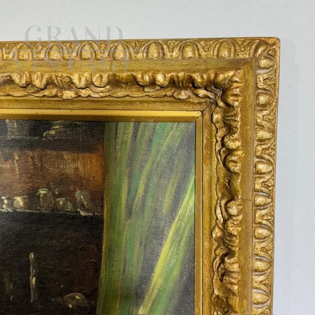 Atelier d'Artista - dipinto antico raffigurante un pittore che dipinge nel suo atelier, un olio su tavola di scuola francese del 1850 circa, firmato in basso a destra, completo di cornice in legno massello intagliata e dorata. Il dipinto raffigura una scena insolita con bottega d'artista, ed è in ottimo stato, pronto da appendere.