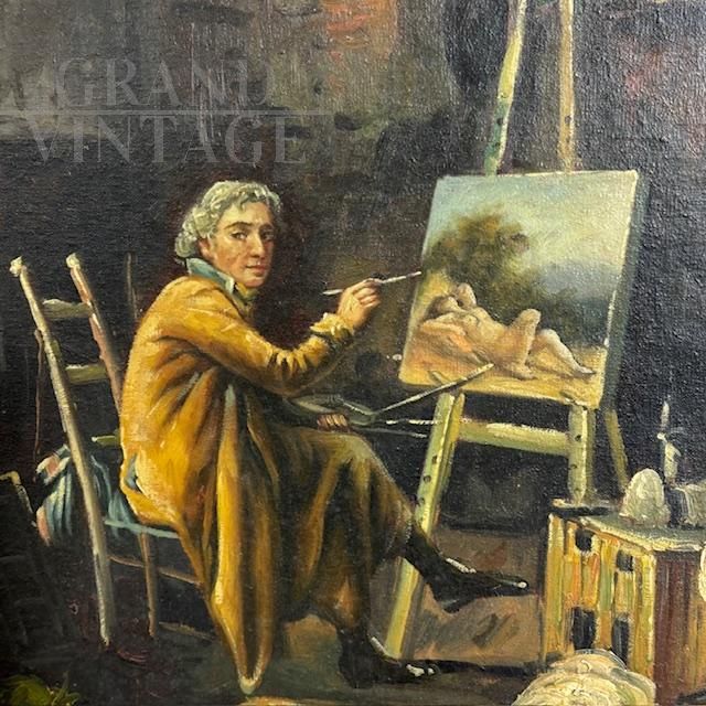 Dipinto antico raffigurante l'atelier di un pittore, 1850
