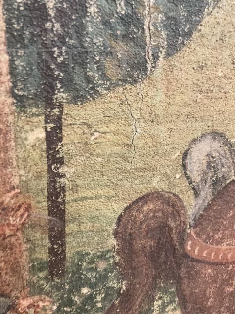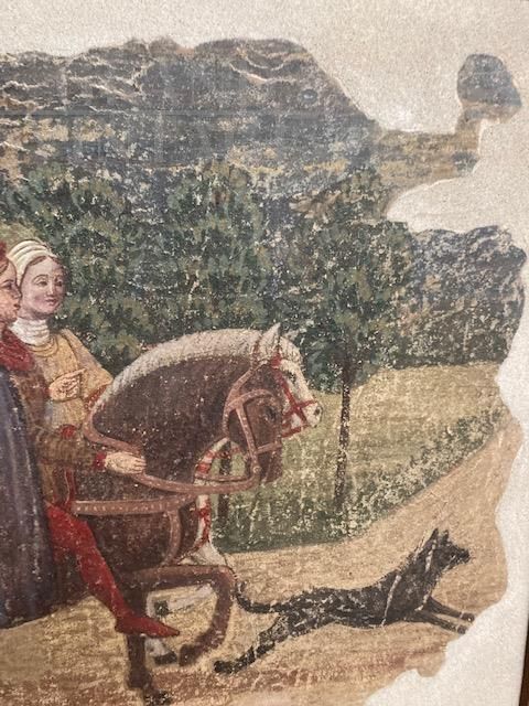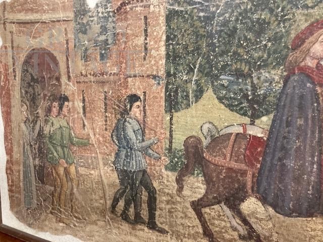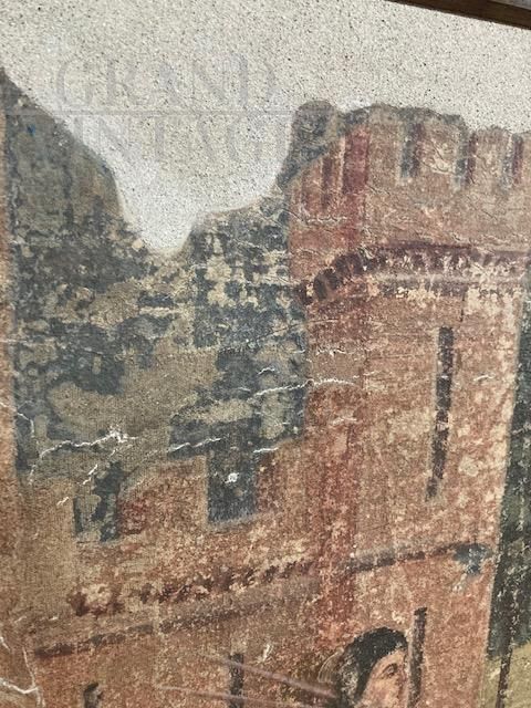 Dipinto antico strappo di affresco raffigurante nobili a cavallo e castello