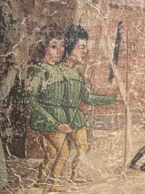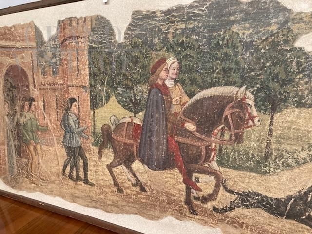 Dipinto antico con strappo d’affresco raffigurante nobili a cavallo e castello, attribuito a Umberto Giunti Siena (1886 – 1970 ), pittore falsario senese formatosi alla scuola di Icilio Federico Joni, cosiddetto Falsario in calcinaccio. Il dipinto in esame, infatti, trova analogie di stile con i lacerti di intonaci realizzati a fresco raffiguranti personaggi in costume, in gran parte oggi conservati alla Galleria Nazionale di Dublino. L'opera è stata realizzata nel XX secolo.