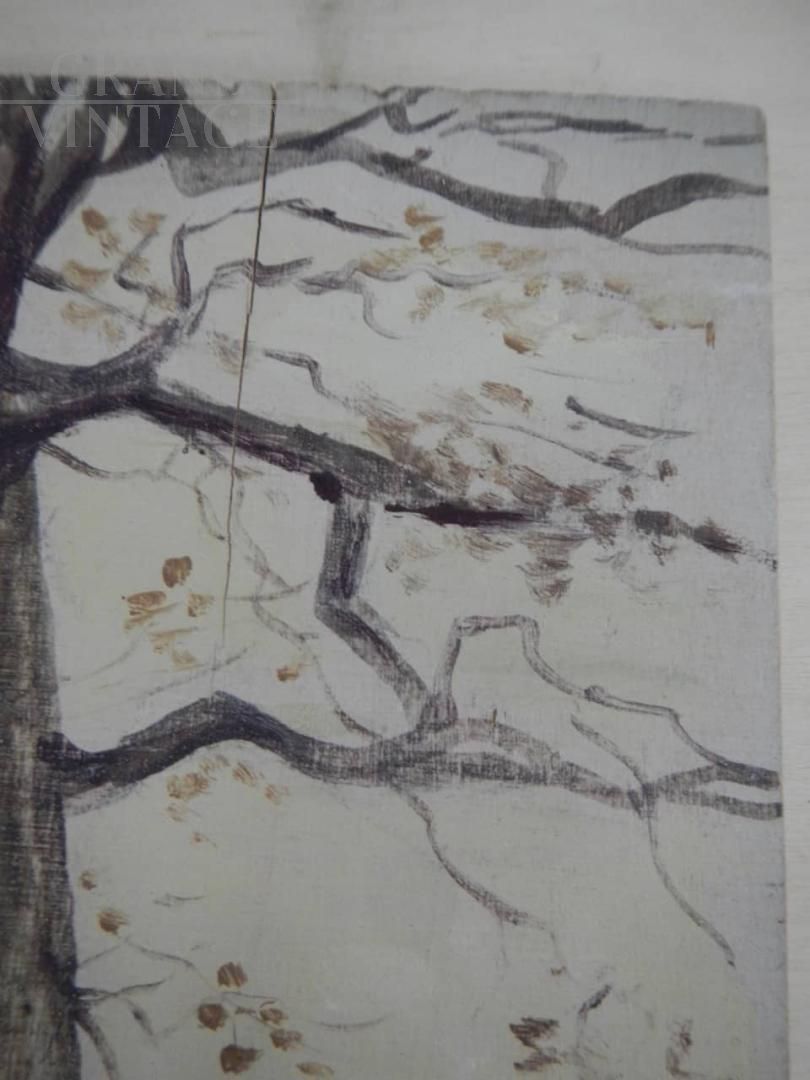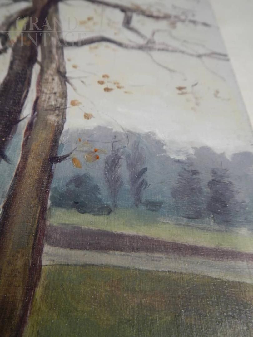 Dipinto di paesaggio autunnale con albero spoglio, olio su tavola, nello specifico sul coperchio di una scatola di colori. Il dipinto si può collocare tra la fine del 19° secolo e l'inizio del 20° secolo. Certi piccoli dipinti sono firmati ma con firma non comprensibile, e recano il nome del paesaggio di ispirazione.