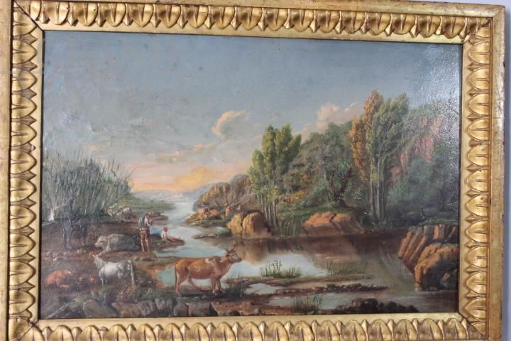 Dipinto antico olio su tavola di fine '700 raffigurante una scena bucolica con paesaggio, personaggi e mucche al pascolo, firmato sul retro Massimo d'Azeglio, completo di cornice antica dorata. Bellissima la qualità pittorica, realizzato su tavola di noce, in buono stato.