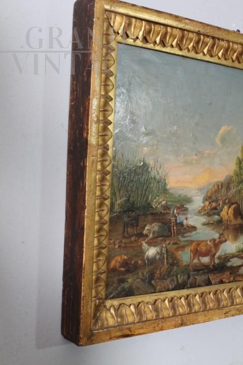 Dipinto con scena bucolica, olio su tavola di fine '700 in cornice antica
