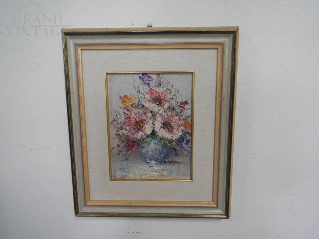 Dipinto con vaso di fiori, olio su tavola, Italia anni '70, completo di doppia cornice, non firmato.