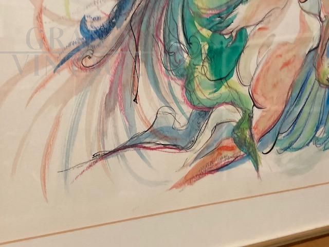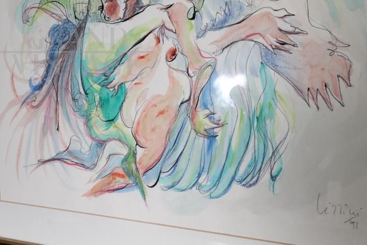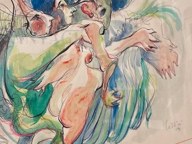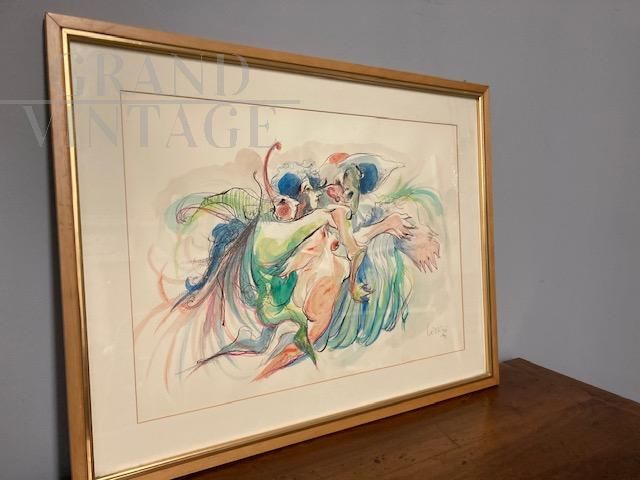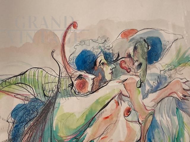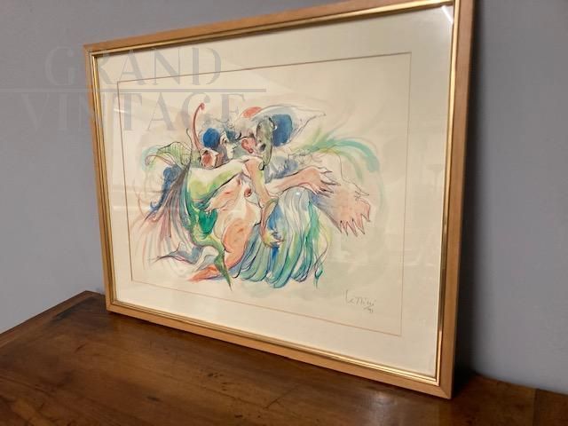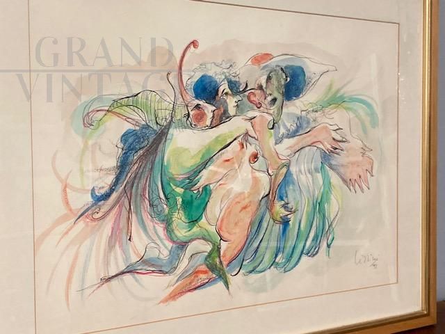 Dipinto acquarello e china di arte moderna e contemporanea con figure femminili, datato e firmato Giuseppe Lizzini 1992, completo di cornice con vetro.