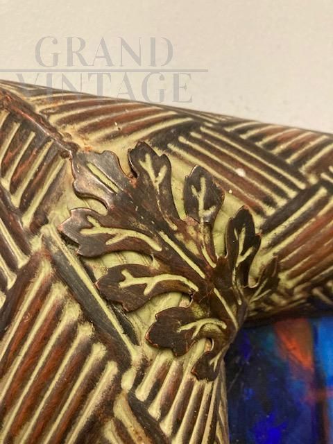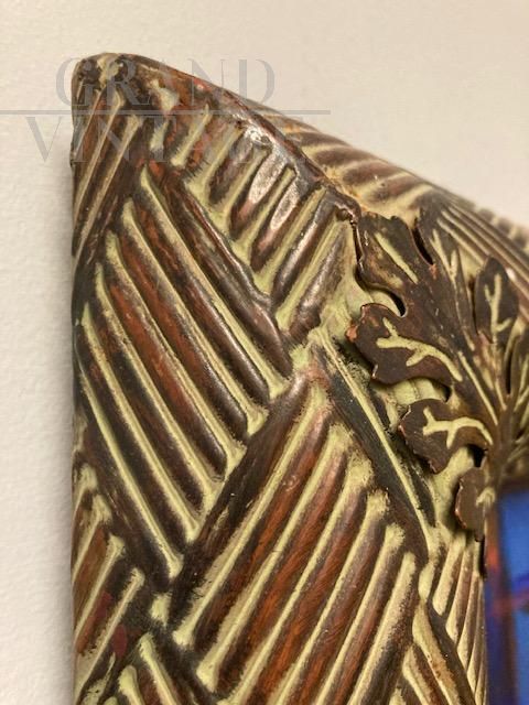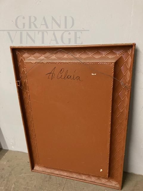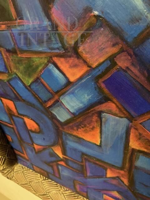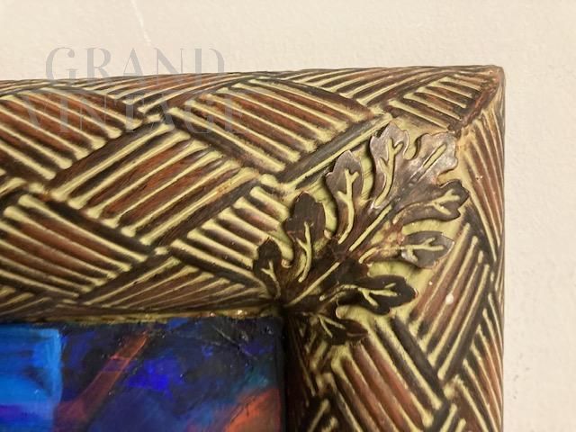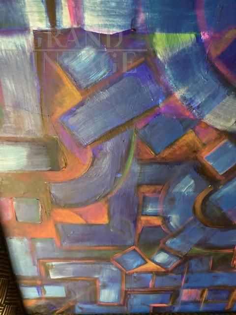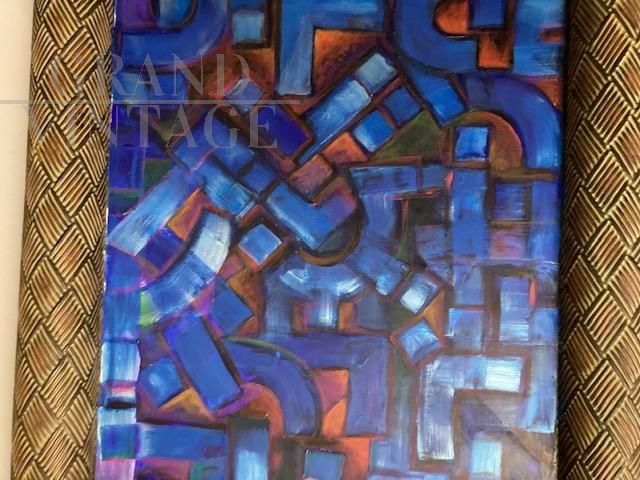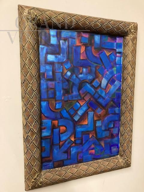 Dipinto di arte contemporanea con geometrie realizzato a smalti policromi su metallo, con fondo nelle tonalità del rosso e del viola e poi in scale di blu. Cornice bellissima intagliata in metallo. Artista del XXI secolo, opera firmata sul retro.